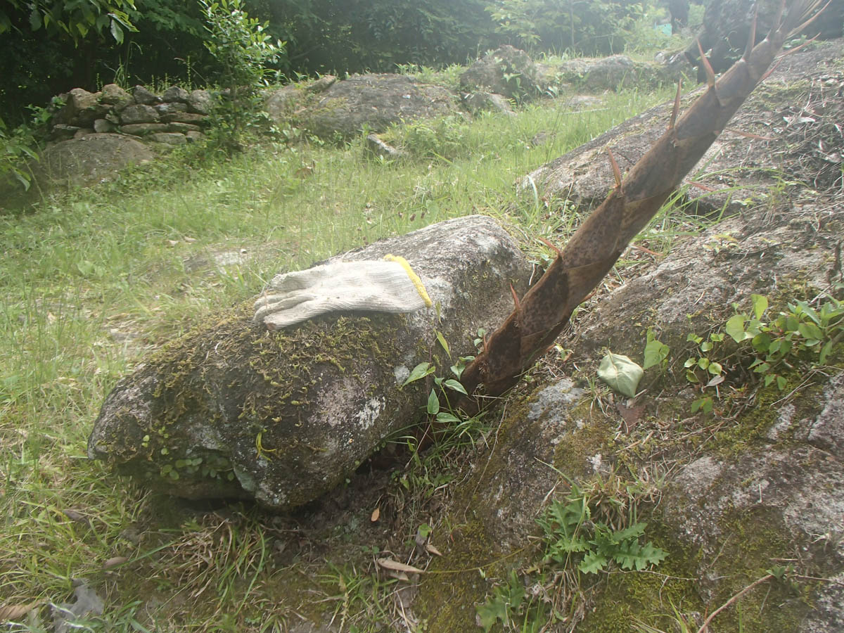 タケノコの季節はほぼ終わりになりました。今日畑に降りていくと、大きな石を持ち上げて畑の境界内に出ていました。すごい力ですね。でも、力?よる隣の竹林からの境界の現状変更(侵略)は許さないと蹴倒して我が畑の防衛をしました。どこかの国のように、核兵器という強力な武器による脅しは無いので反撃できました。それでも大石は不安定に浮いたままで、安定(復興)するまでに時間がかかるでしょう。