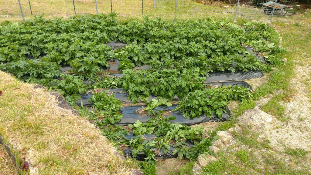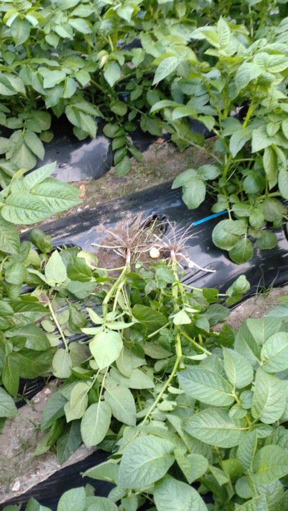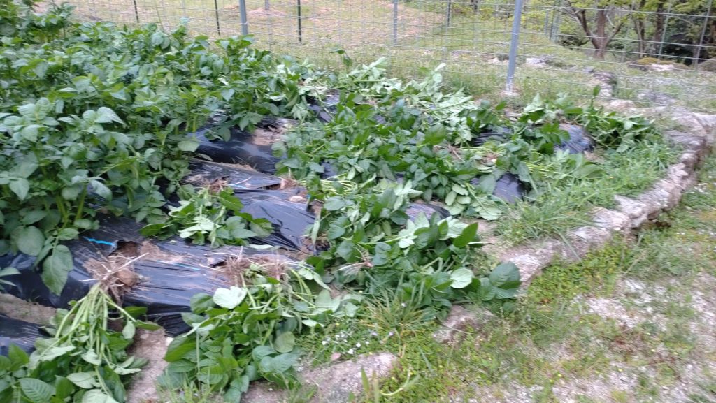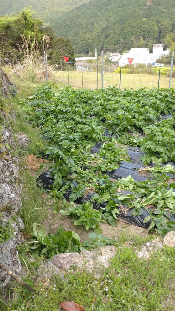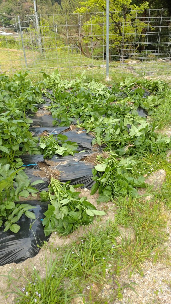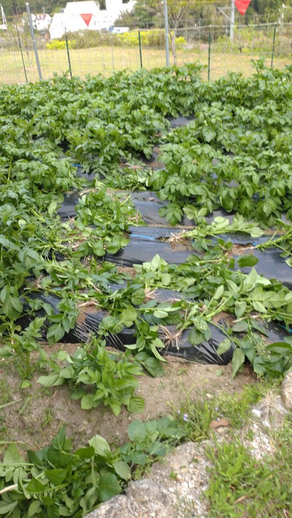 昨年ジャガイモを収穫し、友人たち数カ所に送ったところ好評だったので、昨年の倍ほど、5種類の品種を植えました。先月、他の人より順調に良く育っているので、友人にその生育状況の写真を送りました。その1,2時間後畑を見るとこの有様です(写真のbefore、afterを見てください)。しかし、タイミングが良すぎると思いませんか。鹿と猪は昼間は近づかないし、フェンスをしたので侵入は無理です。昼間に侵入して悪さをする大型獣は猿しかいません。前から若い雄(離れ猿)がうろついていたのを見ています。群れで来ていたらもっとひどいことになっていたでしょう。荒らした痕を見てみると食い散らかした様子は見られず、行き当たりばったりで引っこ抜いた感じです。