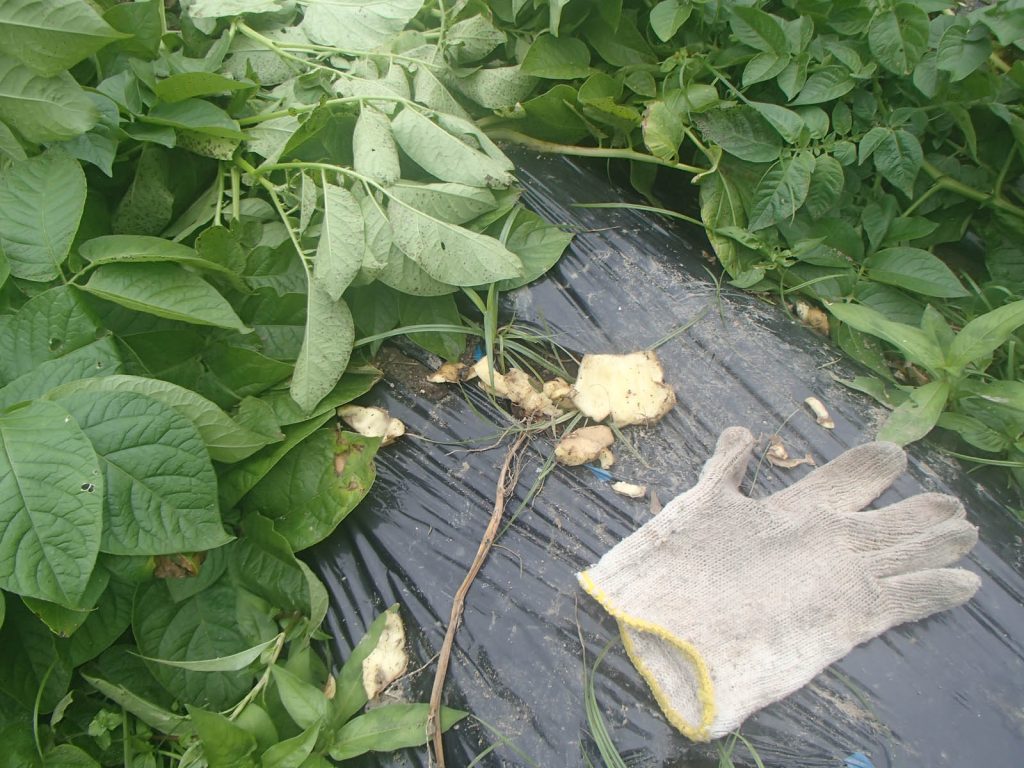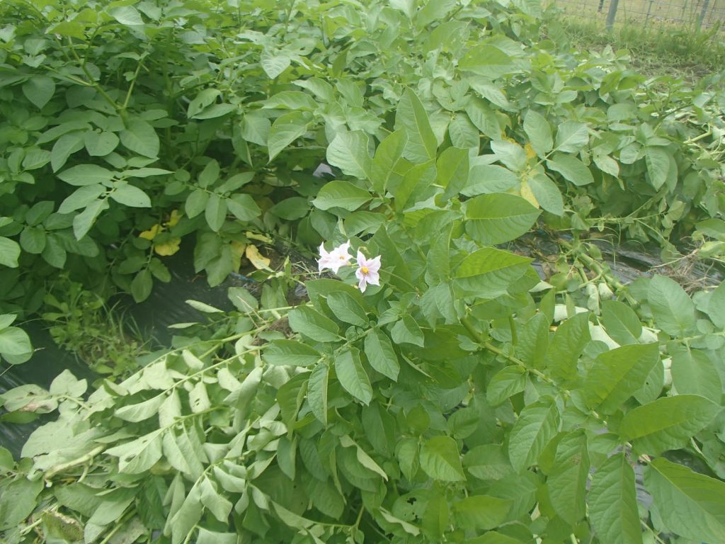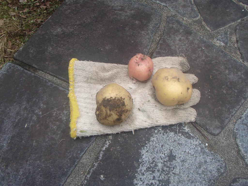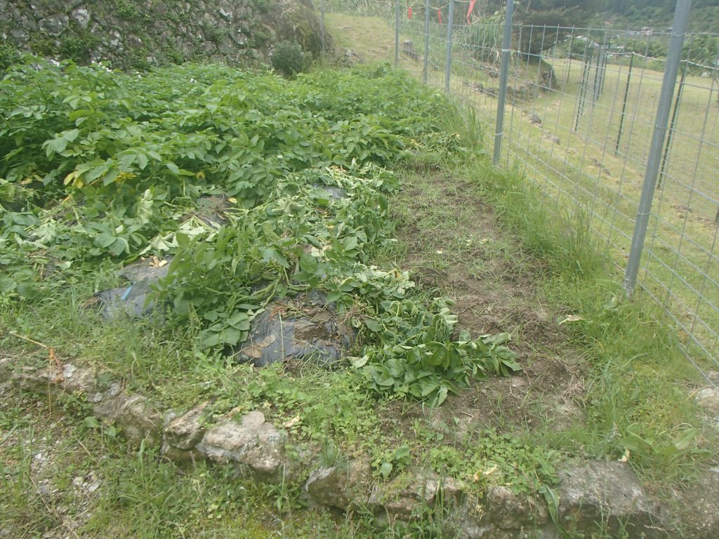 話は前後しますが、今日の被害状況です。前の被害の時に、引っこ抜いただけと思う、と書きましたが、今日の状況を見ていると食べていたようです。今は花も咲き始め、もうじき収穫時期になるはずです。付近の人が言っているように、収穫時期を知っていて食べに来たことも考えられます。今回は皮を残して食べています。別に皮ごと食べても気にならないくらいなのに、相当な美食家なのでしょうか。土がついているのを避けたのかも知れませんね。残していった写真のジャガイモは、「トウヤ」と「サヤアカネ」のように思います。荒らしていったので、記録に残した植え付け品種の場所がよく分かりません。