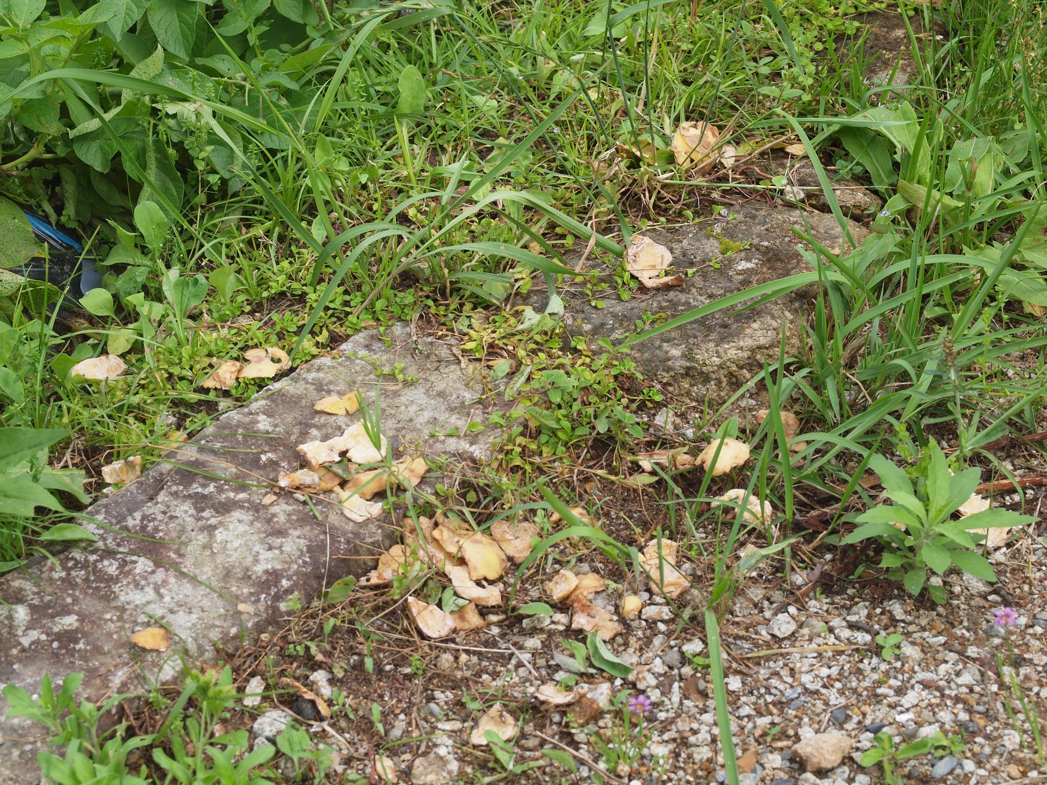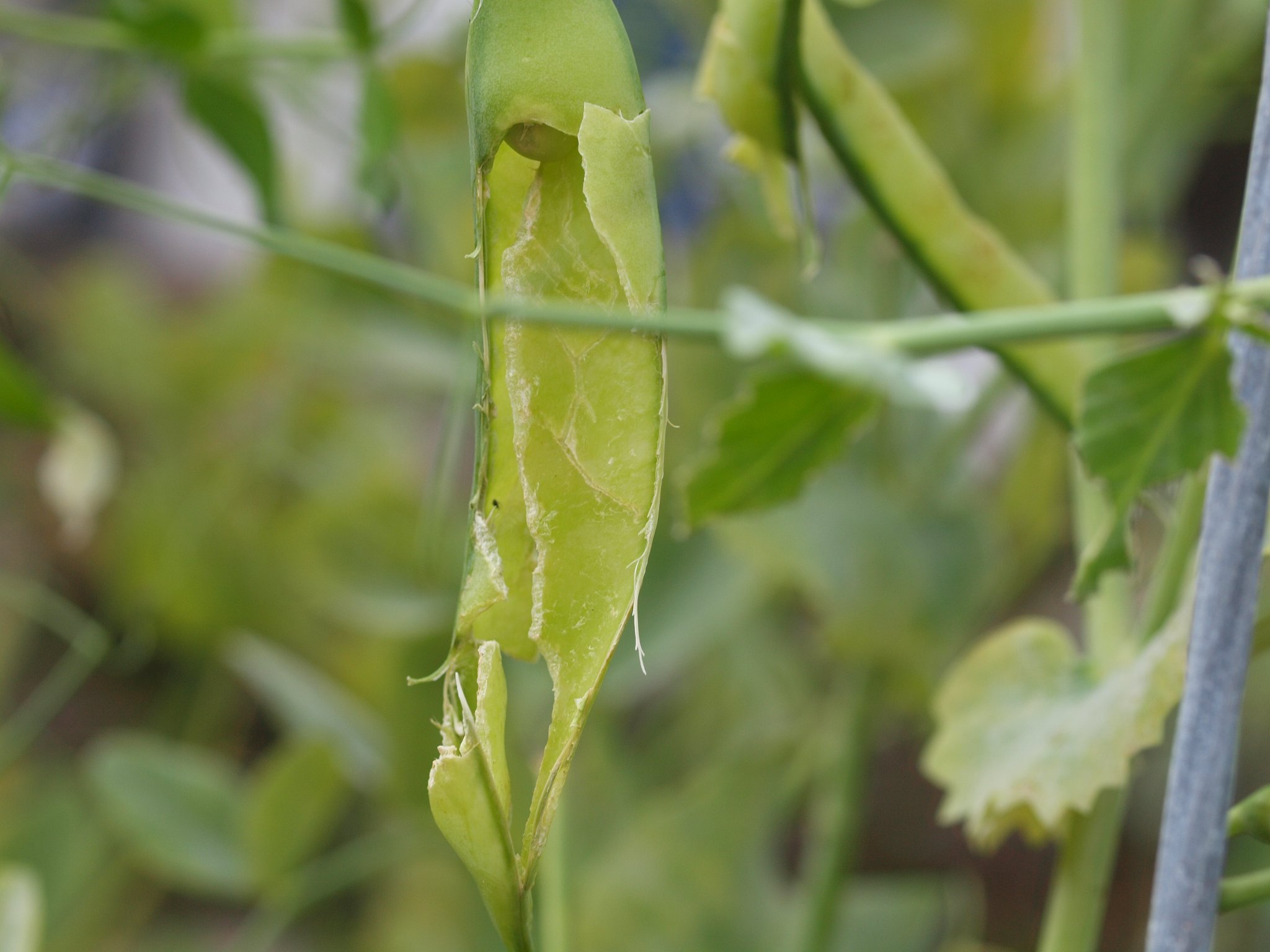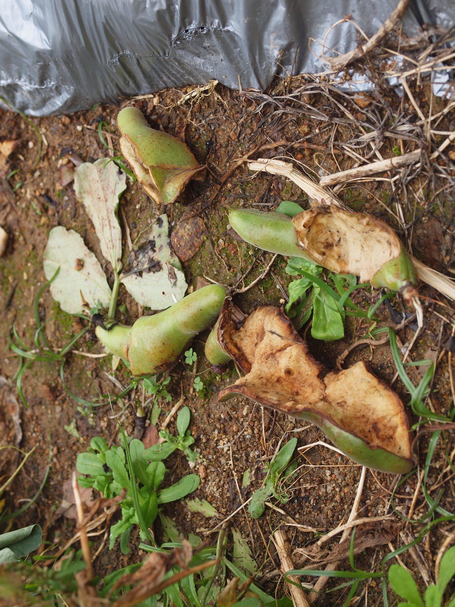 タマネギは中心部の部分を食べているようです。この部分が旨いと知らない猿はタマネギを食べないようですが、中心部が甘いことを知っている群れはタマネギのその部分を食べる、と聞きました。どうもこの付近の猿は学習しているようです。エンドウは2種類とも皮ごと食べる種類ですが、この雨の2日間収穫していませんでした。それなのか、豆が大きくなっているものを選択的に豆だけを取り出して食べています。エンドウは蔓が引っ張られて折れると、枯れてしまいます。もう終わりでしょう。最も悲しい被害はソラマメです。私の大好物で、ビールを飲みながら食べるのを楽しみにしていました。試しに大きくなったものを1鞘食べて美味しかったので、一部を雨上がりに収穫しようとしていた矢先でした。ソラマメの鞘の小さなうちは上を向いていますが(ソラマメの名の由縁)、大きくなると下を向き食べ頃になります。猿の食べた後を見てみると、大きなものは中の豆を食べて食い散らかして、小さなもの(上を向いている)は残しています。よく知っています。株ごと荒らしてもいて、先のことも考えてほしいものです。 明日は出かけなければならないので、どうなるか心配です。私が出かけるのを見張っているような気もします。また被害報告を出さないで済むように願うばかりです。