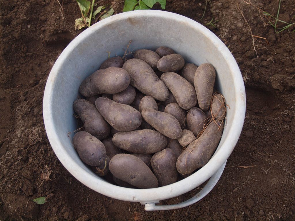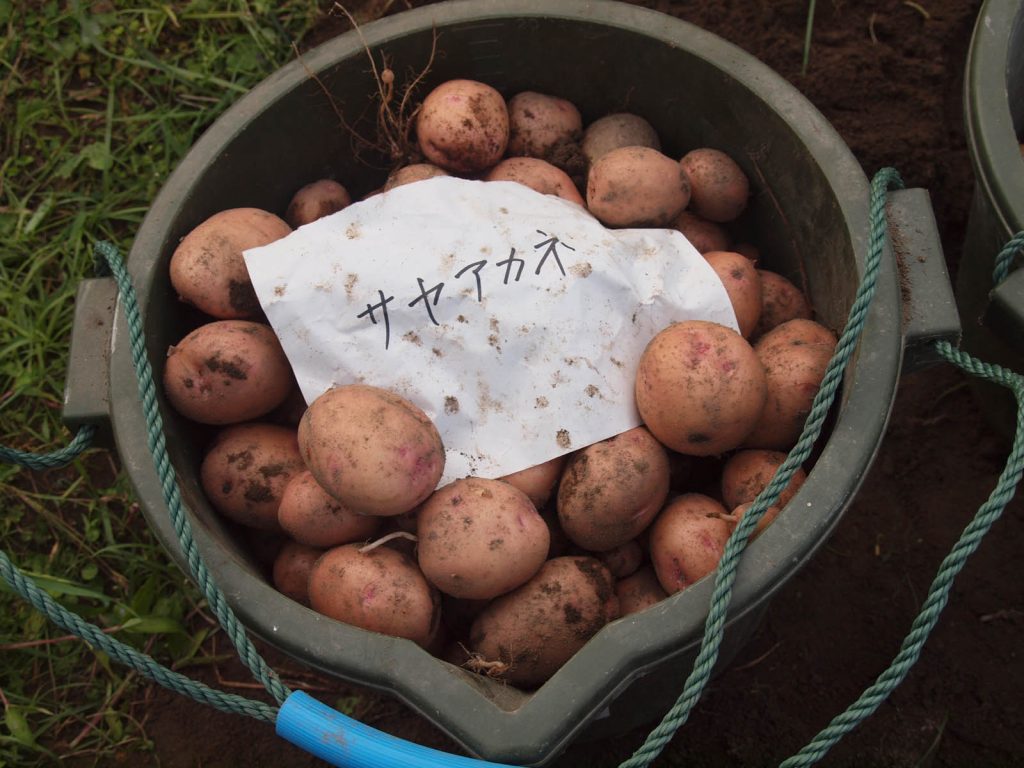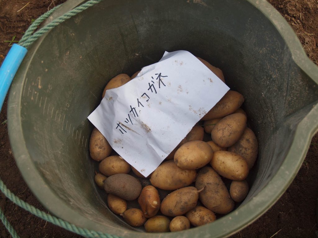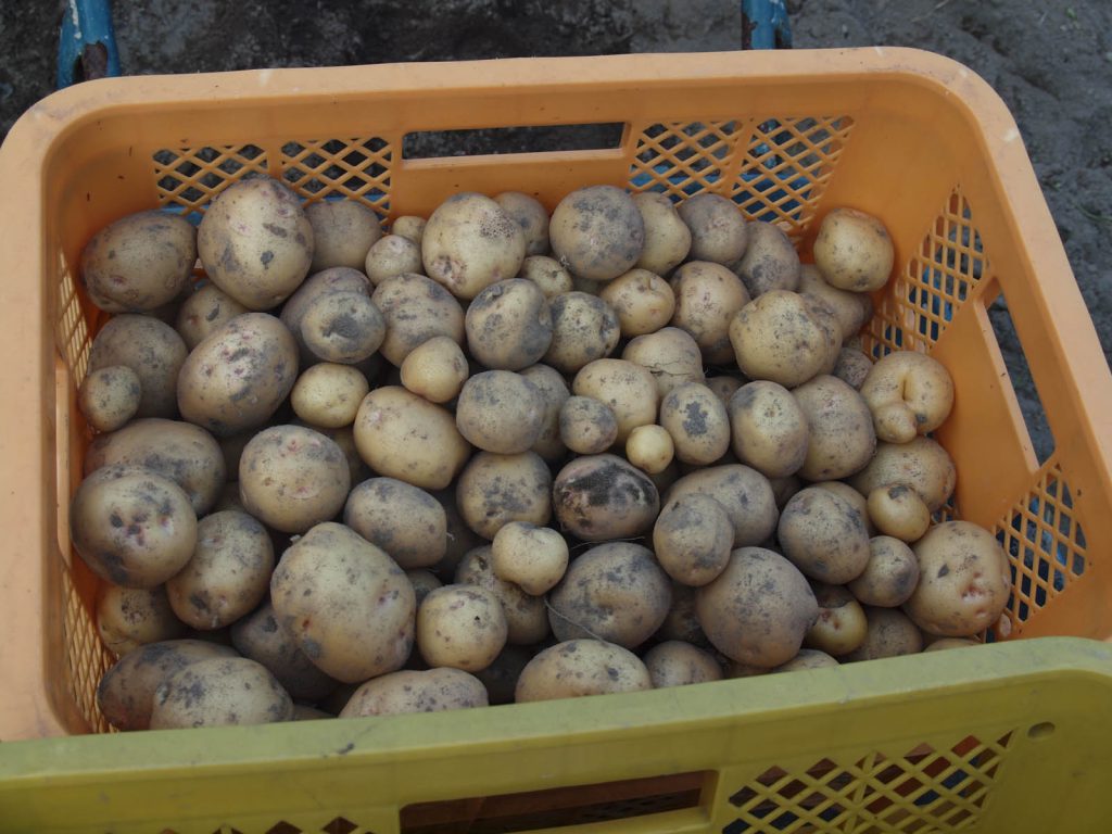 今日は良い天気になりました。やっと猿より先に、残ったジャガイモを掘り出すことができました。でも、被害のあったところを選んで収穫していたら、畑の3/4位を掘り起こしていました。残したところも完全ではなく、所々が荒らされていて、比較的被害が少ない場所と言ったところです。先月の末に被害にあった株(場所)では、ひどく荒らされたところには、全然芋がないか、あっても小さなものしかありませんでした。先日、荒らされても茎がしっかりしている株はそれなりに大きな芋が収穫できました。記録を調べたら、6品種植えていました。全品種とも収穫には少々早いことは確かなのですが、品種により芋の育ちが違うようでした。詳しくは明日全部収穫してからお知らせします。収穫した後の畑の様子と、採ったジャガイモの写真を速報します。