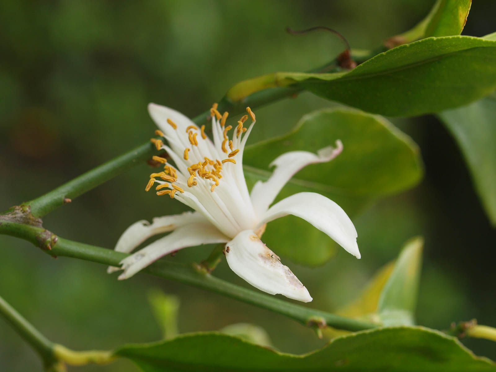 今日、終わったと思っていたレモンの花が1つ咲いてるのに気がつきました。普通のミカンの花より少し熱帯の花の感じがします。