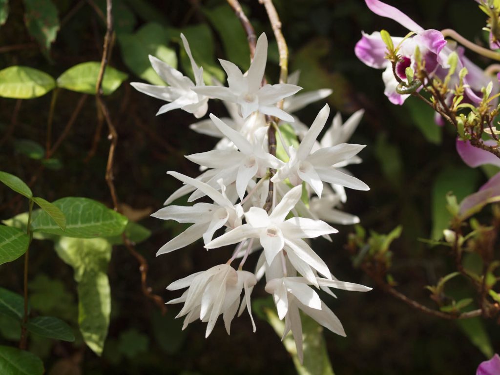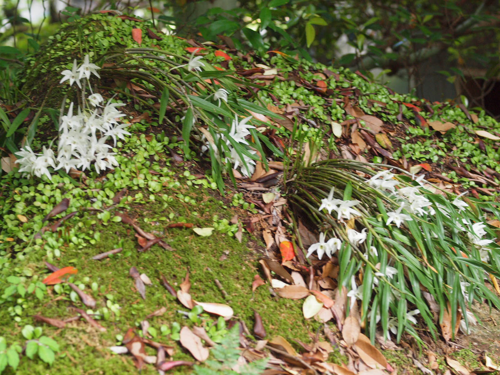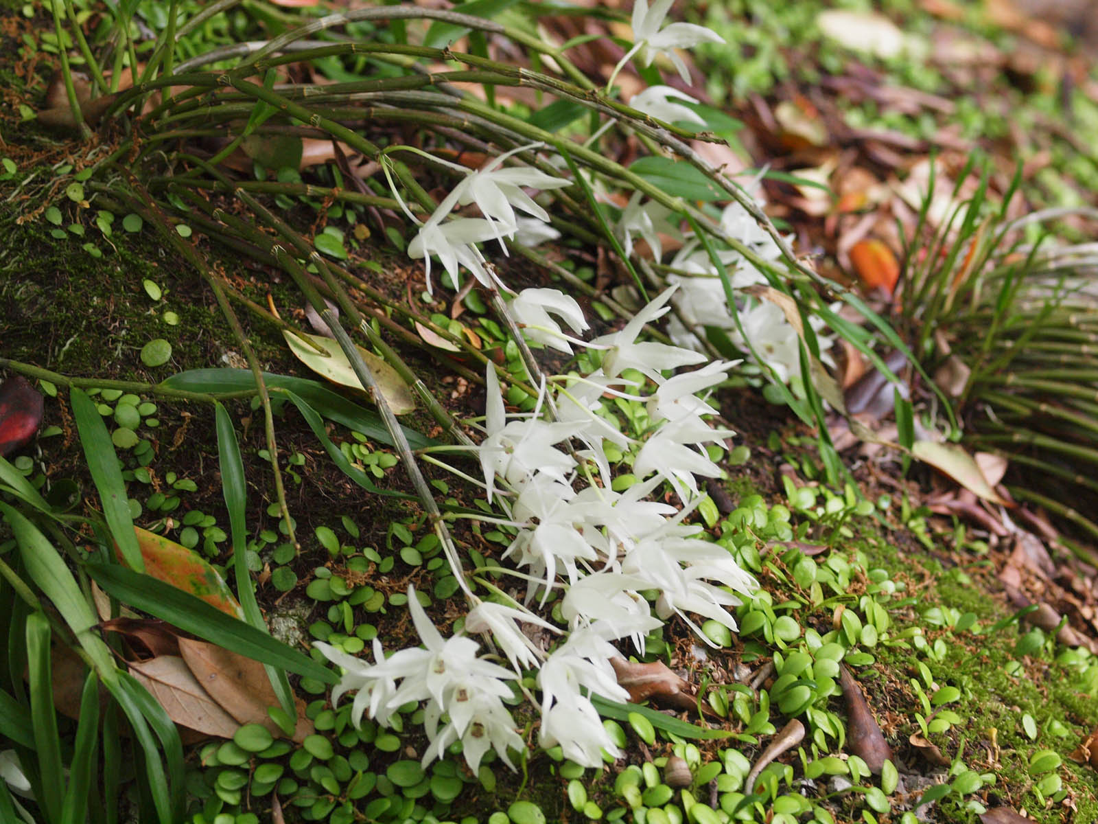 この場所とさらに奥まった暗いところには他の蘭が咲いています。同じデンドロビウムですが、明らかにセッコクD. moniliformeという種類です。徐々にですが増えているようです。特に他の競争相手がいない暗い場所では顕著なような気がします。この種類も栽培品種があるようですが、原種のように思います。あまり派手ではなく気に入っています。