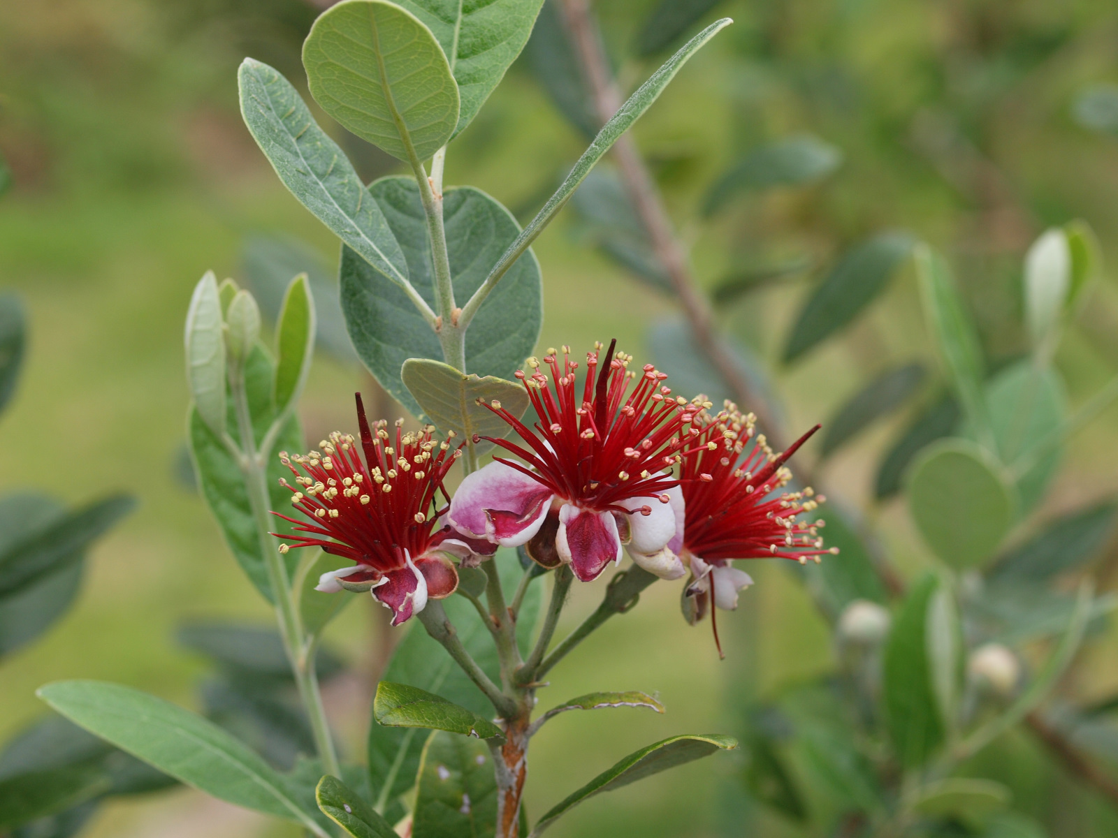 最近、フェイジョアの花が咲き出しました。少々変わっていますが、綺麗な花です。我が家の側には品種の違う3本を植えています。