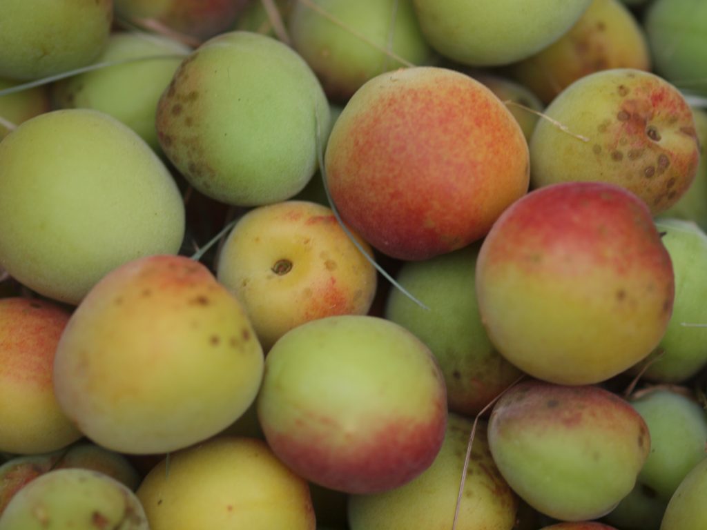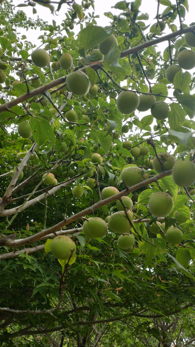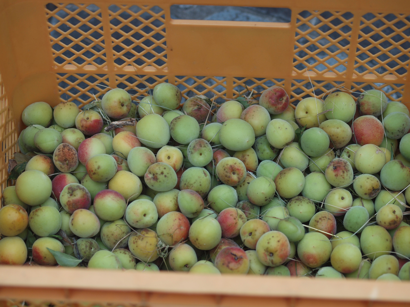 4日前に留守にしている友人の家の梅の木を見に行きました。まだ収穫には少し早いということで、梅を落としたときに見つけやすいように、膝の高さまで伸びていた梅の下草を刈り、今日収穫しました。良い天気が続いたので、梅の色が黄色みを帯びたものが多くなり、まだ結構残っていますが、2本の木から合計40kgほどの収穫でした。管理?の役得として全部私のものになります。普通は実に傷が付くので、手で取って採集するようですが、手荒に木を揺すって落としましたが、拾うだけでも大変な作業です。梅農家の人の苦労が分かります。でも、梅は猿とか鳥に食われないので、当地では比較的楽な作物かもしれません。