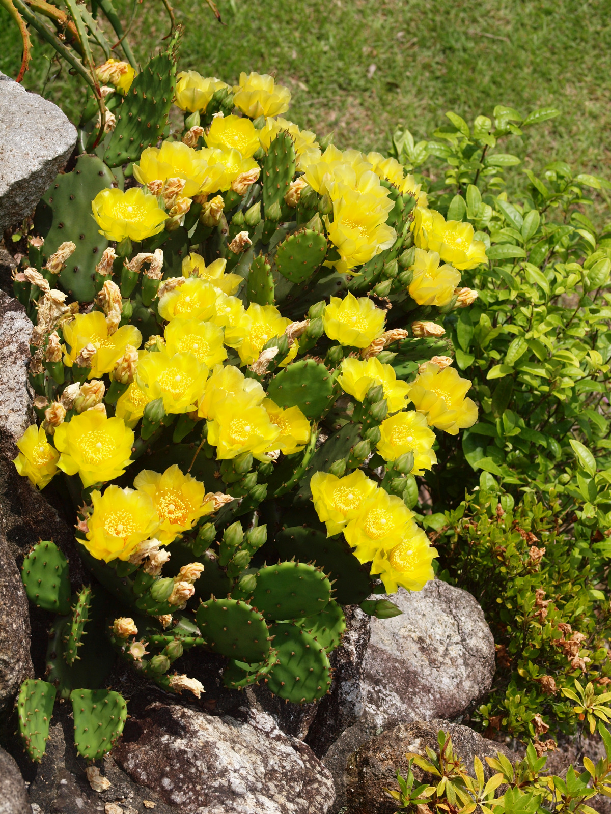 雪国で友人が鉢植えで育てていたウチワサボテンを、こちらへ来るときにいただき、家の前の石垣に地植えしました。結構株としては大きくなったのですが、暖かい季節に伸びたものが、冬の寒さのために毎年萎れてしまいます。多分、寒風が当たるところで、霜が降りるためかもしれません。それでも、今の季節になるとたくさんの花を咲かせます。綺麗です。寒さに耐えたらこそ、たくさんの花を咲かせるのでしょうか。
