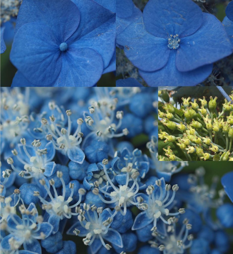 ガクアジサイ装飾花の中央の花(上段左:つぼみ、上段右:開花)、両性花(真花)の蕾と花(下段)と残った子房(下段右上)