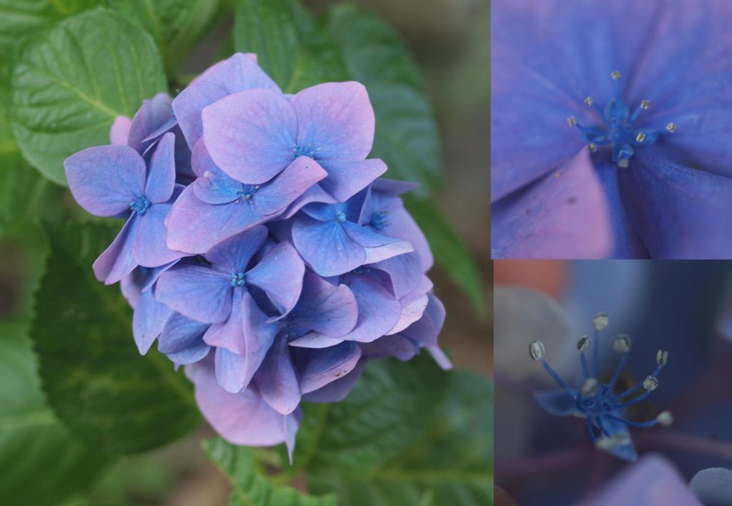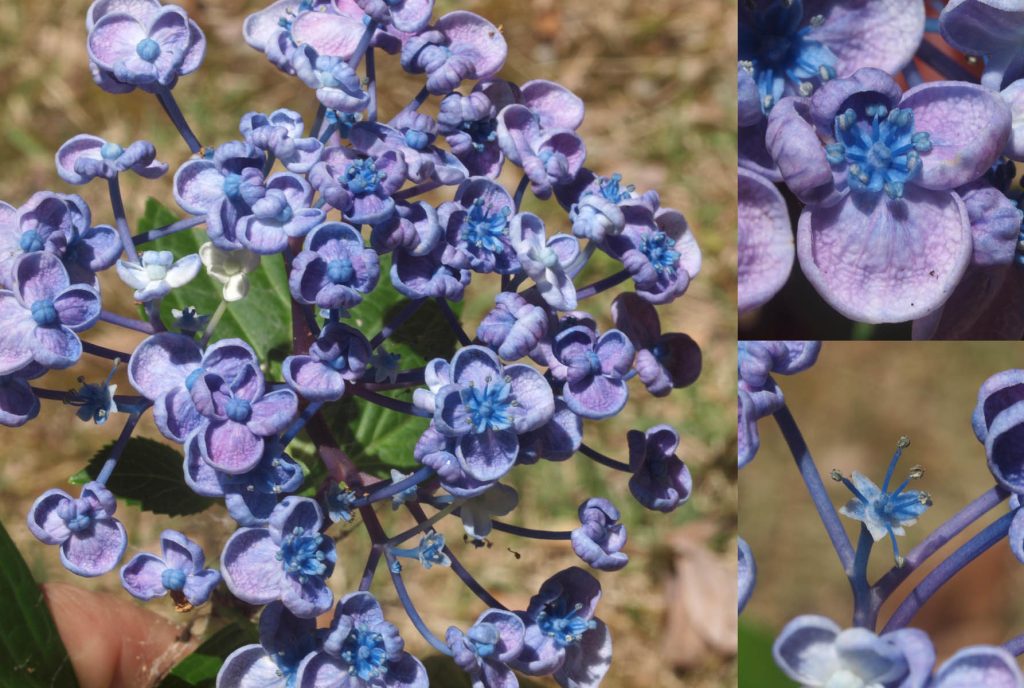 大雨で梅雨が始まったと思ったらすぐに終わってしまいました。梅雨の花と言えばアジサイ。アジサイの種類は多く細かい品種名はわかりませんが、私の家には日本で誕生した3種類(狭義のアジサイ名:ホンアジサイ、ガクアジサイ、ウズアジサイ)を挿し木により増やして植えました。一般的なホンアジサイは鹿の食害(後の機会に)、ウズアジサイは日当たりなどであまり大きな花を咲かせていませんが、ガクアジサイは綺麗に大きな花を咲かせています。この種類は多くの品種の原種とされています。私の一番好きな花なので、写真を撮り始めました。花を撮影しながら詳細に観察するうちに、その独特な花の形状が面白くなりたくさんの写真を撮ってしまいました。アジサイは一般的な花なので皆さんはご存じかもしれませんが、ガクアジサイを中心にそれらの写真を紹介したくなったので今回は独立してアジサイの花を載せました。
