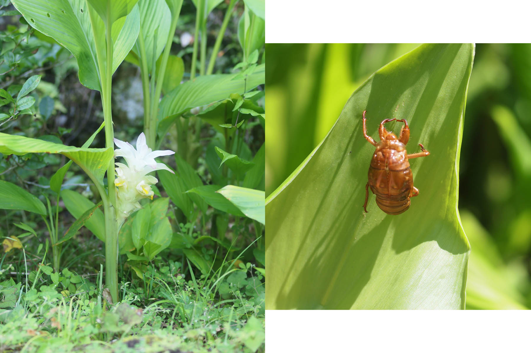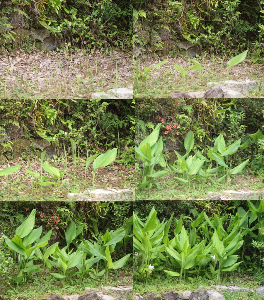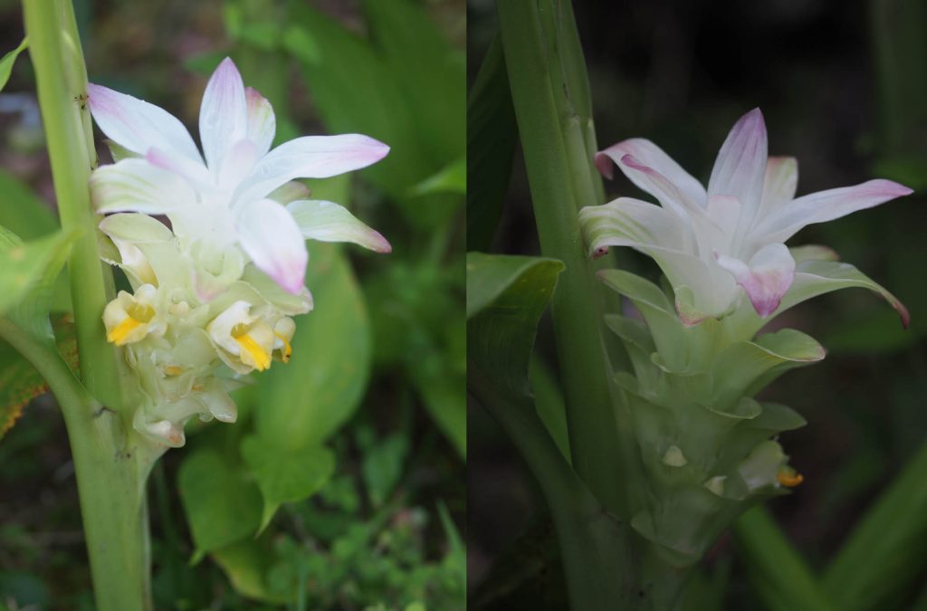 楽しみにしていたウコンの花が咲きました。この花は透明感があり、エキゾチックな雰囲気があるので初めて見たときは感激しました。庭には株が3ヶ所あります。その中で一番小さくて、疎な株では、見やすいところに花が咲きます。ウコンは急速に大きな葉を伸ばし、大きな株となり他の植物を圧倒していき、初冬には枯れてしまいます。毎年芽を出しますが、その芽生えは非常に遅く、5月下旬から6月初旬頃です。私の周りに生えている植物の中で、目立つことも有り、一番遅いのではないかと思っています。