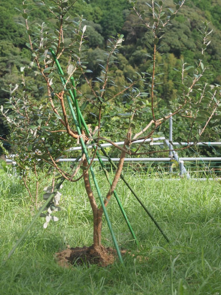 台風14号が過ぎて、昨日は久しぶりの晴れでした。倒れたフェイジョアを、台風の通過中の雨の中で応急処置をしただけなので、その片付けと倒れた木の補強をしました。慌ててやったので、ずいぶん派手な選定をしたものだと思います。でも普段の選定だと、せっかく伸びて大きくなった枝をなかなか切れないので、思いきった枝切りができたと思うことにします。一応、切り跡には傷薬をつけ、根元には新たに土を盛り上げました。応急用のセメント用砂袋は片付けました。後は無事に根付いてくれることを願うばかりです。倒れた木以外の2本は無事でした。