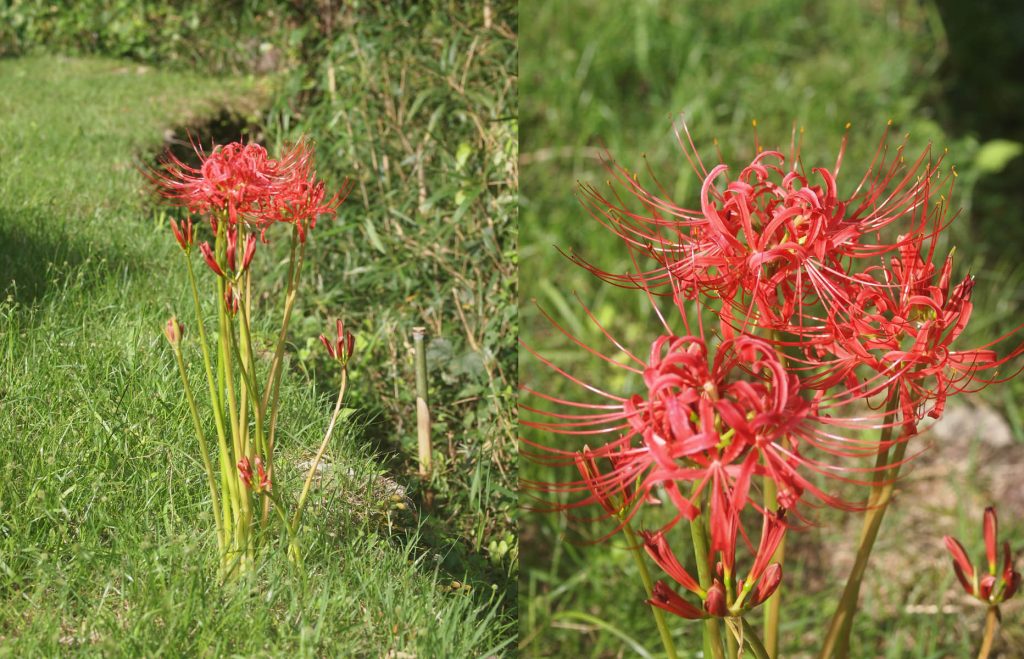 天気予報によると今日からまた雨が続くようです。それも一両日中は大雨の予報でしたが、今日は夜半から小雨が降る程度です。そこで、天気の良い昨日のうちに作業すべく、フェイジョアの始末が終わるや慌てて家周りを草刈りしました。離れた畑の方が伸びているのですが、1日では終わらないので後回しにして、家周辺にある家庭菜園用の畑のみにしました。20日ほど前に草刈りした国の小径(赤道と言うそうです)に彼岸花が咲いていました。彼岸花は草刈りした後から一気に花茎を伸ばし花を咲かせます。他にも少し咲いている場所がありますが、まだ少し早いようです。草刈り中は咲いた花でも蕾でも面倒なので一気に刈ります。しかし、家の窓から見える石垣上の片隅に、蕾のものがまとまってありました。ちょうど、ニュースで津屋川堤防の彼岸花が咲き始めて、保存会の人が紹介されていました。それを見て気になっていたせいか分かりませんが、その場所を刈るのがはばかられて花を咲かせてやることにしました。咲いた花も綺麗ですが、蕾を見るのもなかなか興味深いとその時気がつきました。でも、草刈りした後にどこにでも生えてくるので、なかなかやっかいな植物です。種もつけないのに思いがけないところに出てきたりして、どうして分布を広げるのか疑問が残る植物です。