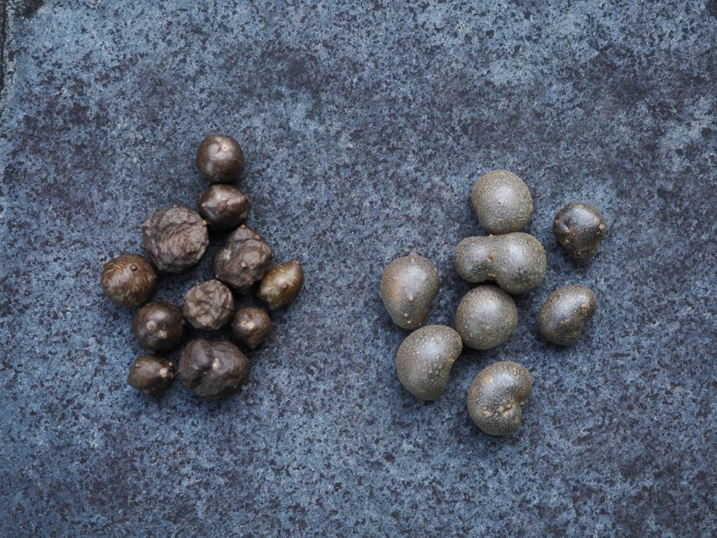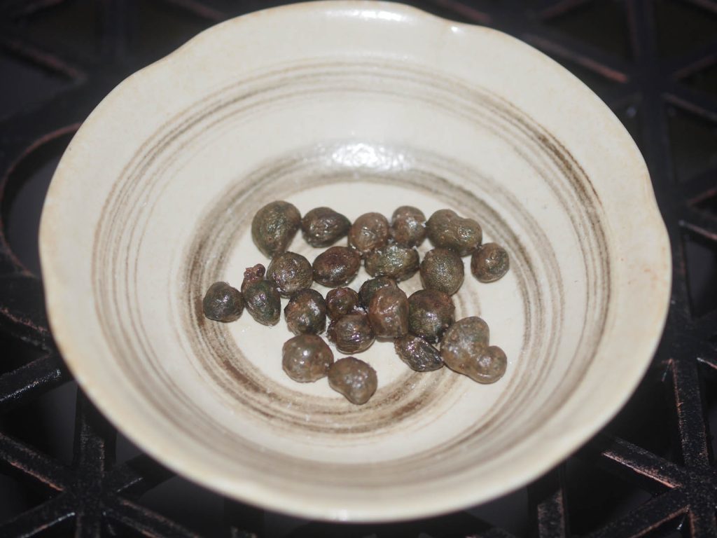 ムカゴについて気をつけなければならないのは、同じ場所で見られるニガカシュウのムカゴです。実際これを食べた人によると、とても苦いようです。苦いだけではなく、毒性もあると言われています。通常のむかごよりも黒くてゴツゴツがはっきりていて、着いている葉を見ると、幅広いハート型をしているので区別できるでしょう。ヤマノイモのムカゴは炊き込みご飯などで調理されるようですが、無精な私は、フライパンに薄く油を引き、そこにムカゴを入れてコロコロと転がしながら加熱し、皮に皺ができてきた頃に取り上げ、軽く塩を振って食べます。ポテトチップスと芋のようが味がします。なお、あまり不揃いなムカゴを入れると、小さなものは固くなって味がしなくなってしまうことがあります。塩を多めにすればビールのおつまみにはなります。バター炒めという方法もあるそうですが、面倒そうですね。