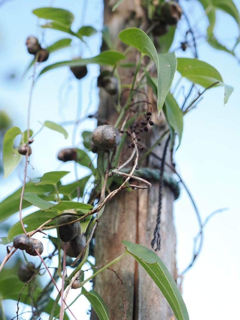 ご要望にお応えして、私も興味があったので、急遽ヤマノイモのムカゴについて投稿します。別に綺麗な花だけが興味があるのではなく、生き物については、私の周辺に出てくる、あるいは過去に遭遇した全てが投稿対象という方針でいます。特に実りの秋は対象が多すぎて季節に追いつかないのが現状です。さて、ヤマノイモは雌雄異株ですが、ムカゴについては雌株だけにできるという記事が見かけられます。しかし、多くは雌雄どちらの株にもできると述べています。雄株のムカゴからは雄株、雌株のムカゴからは雌株。ムカゴはクローンですのでこのようになります。雌株にできる見事な翼がある種子からは雌雄両方の株ができます。雌と雄に分けてムカゴが売られているのが見られるのは、雌雄別々の株から採集したムカゴだから可能なはずです。急遽撮影した雌株には見事な翼がある種子とムカゴが写っています。また、雄株には枯れてしまった花房とムカゴが撮れています。これらは以前投稿したのと同じ株だと思います。