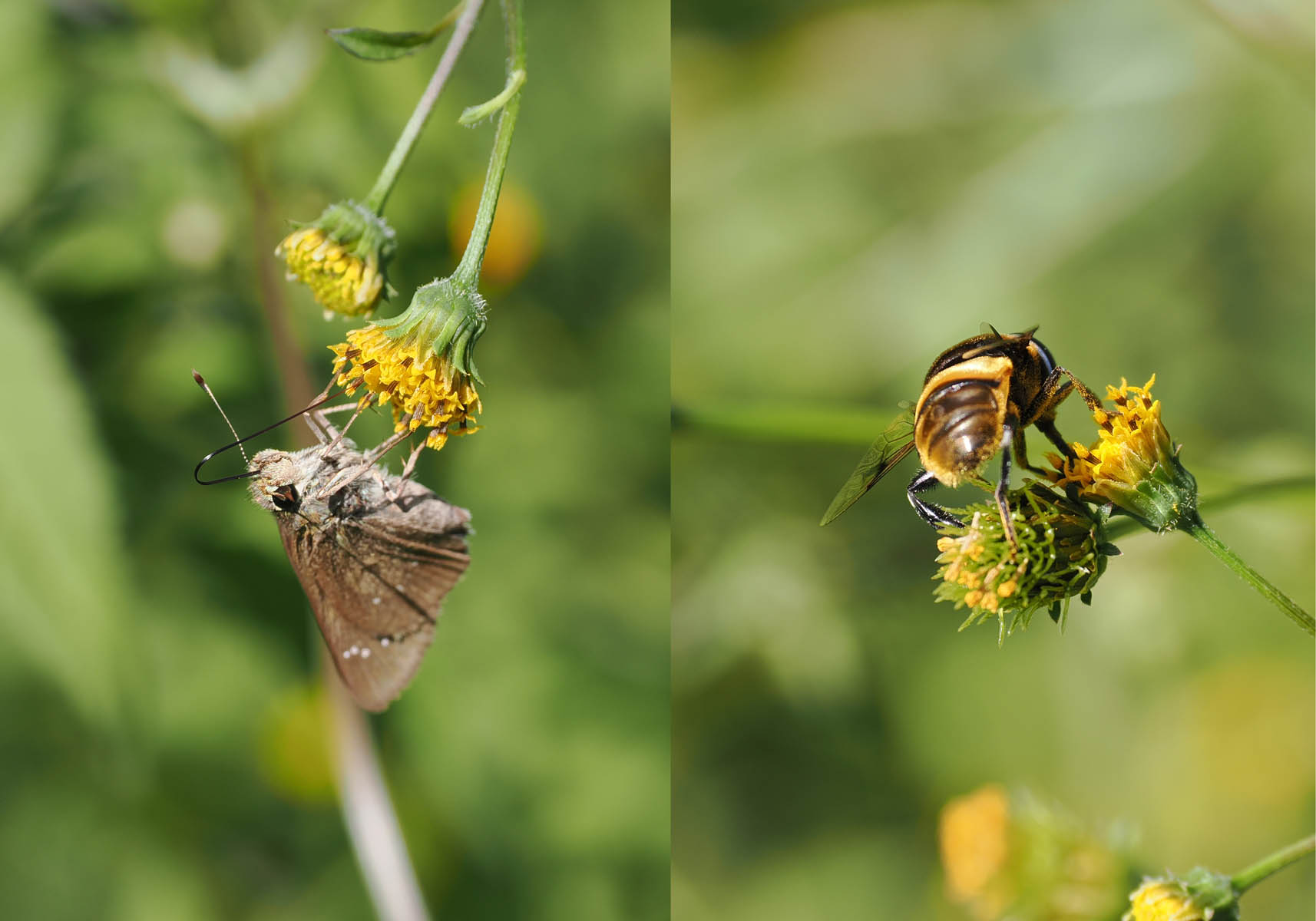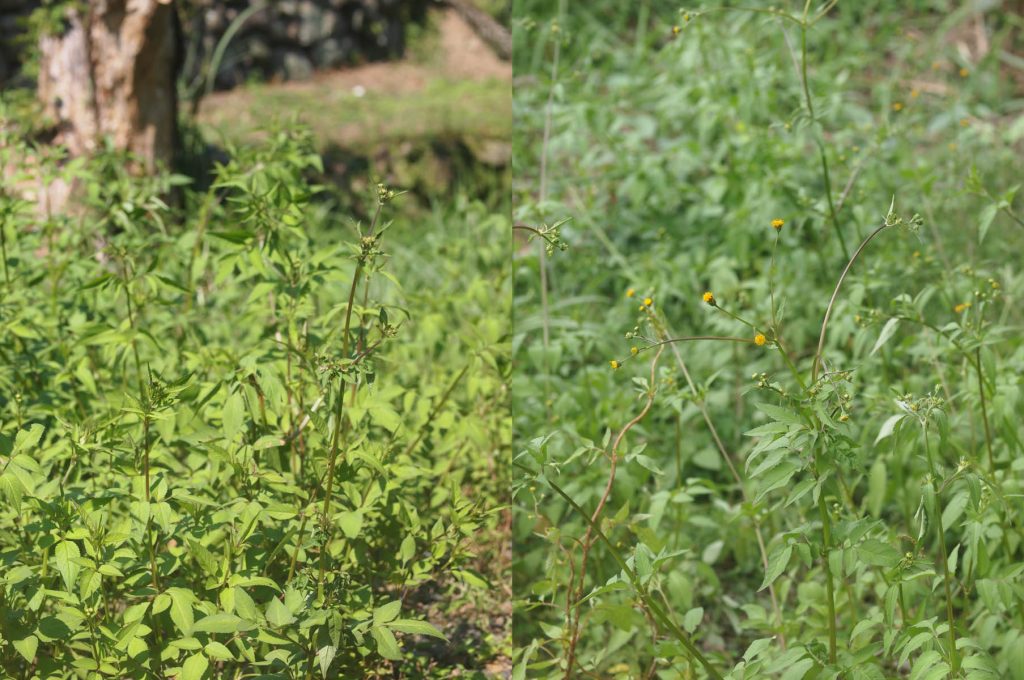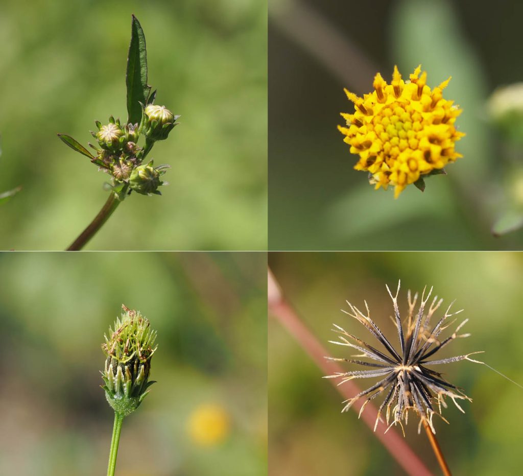 この季節になるとやたらに服にくっつく種子をつける植物があります。通称ひっつき虫。我が家周辺で、その中で一番厄介なのはコセンダングサ。この種には変異が大変多く、コセンダングサは基本変種です。主な特徴は舌状花(いわゆる花びら)がない形です。道ばたなどで人が歩きやすい場所にやたらと生えてきて、ちょうど膝や腰くらいの高さで待ち構え、種子に付いている2本程度の鋭いトゲ、さらにそのトゲには細かい逆向きのトゲがあり、執拗に服にくっつきます。一度くっつくと深く布地に食い込むので一つずつ手で取るしかありません。引き抜いても棘の先端は布地に食い込んで残ります。いつも歩く畑へ行く道などで生えているのを見つけたときは、すぐに引っこ抜くようにしています。それでも見落としたものや他の場所へ行ったときなどに、うっかりしていてひどい目に遭います。それでも花が咲いたときには多くの昆虫が集まってきます。日本には北アメリカから江戸時代に渡来した帰化植物とされています。