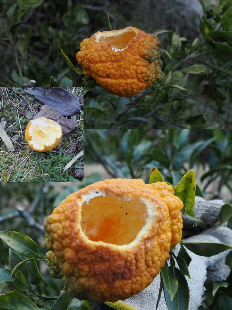 ミカンに対する鳥(多分ヒヨドリ、地面のものはカラスか?)の食害。器用に穴を開けて食べるものです