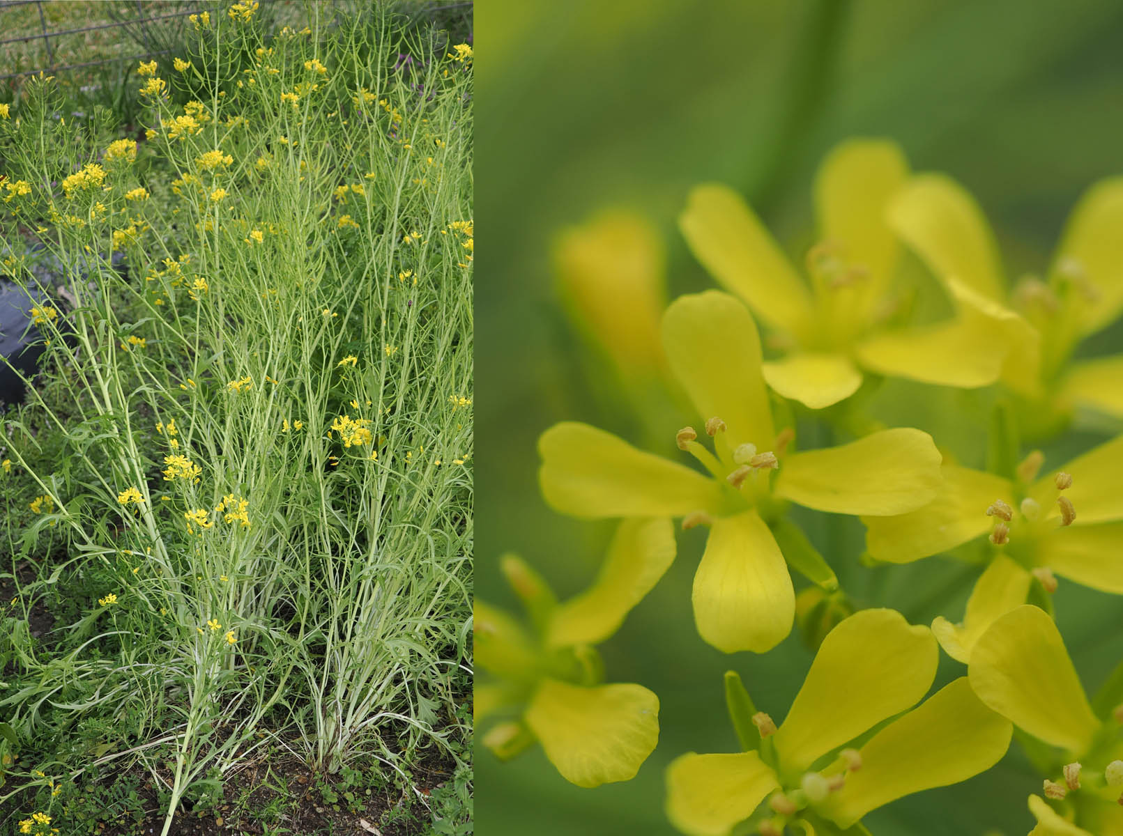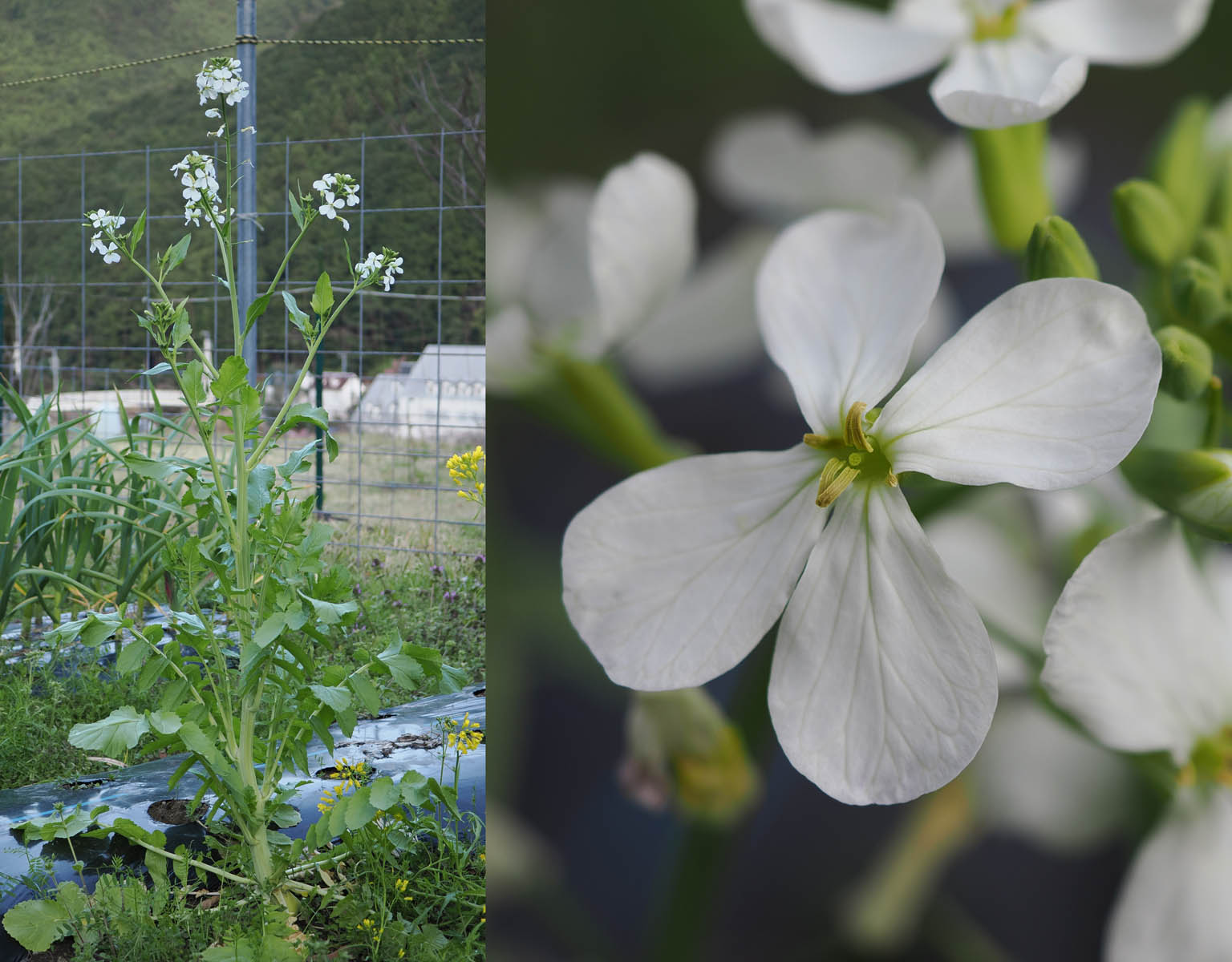 前稿で紹介した木の花に続いて草花を載せるつもりでしたが、緊急に野菜の花を取り上げることにします。以前の記事(昨年の12月7日付)で書きましたが、チンゲンサイと不明野菜が、放置した株の種から耕した畑にたくさん出てきました。自分で食べたり知り合いに差し上げたりしましたが、一部を他の畑へ移植して育てていたところ、結局、食べ切れずに最近続いた暖かい天気のため一斉にとう立ちし黄色い花を咲かせています。ミズナもこれらの野菜と一緒に生えてきましたが、少ないので種を蒔いて育てることにしました。ところがミズナを蒔いて、他の畝にアブラナと間違えてさらにミズナを蒔いたため倍の広さで育てることになり、始末しきれなくて大量に花を咲かせています。これら3種類の野菜の花を見て、不明野菜がチンゲンサイやミズナとどのような血縁があるのか、正体が分かるかと見比べてみました。けれども、ミズナは小ぶりなので花が小さいですが、皆同じ十字花の黄色い花びらでよく似ています。ミズナとチンゲンサイの花のどちらかがダイコンのように白ければもう少し正体解明の助けになったかもしれません。不明野菜を自家受粉させて育てればあるいは分かるかもしれませんが、昆虫が飛び回って受粉活動をしているので交雑していることでしょう。まあ、種を採って植えてみようかと思っています。専門外の遺伝研究の真似事ですかね。不明野菜は食べた評判が良いのでまた生えてくればの期待もあります。ちなみに、ダイコンの花はこぼれた種から畑の隅にできた小さなダイコンから花が咲きました。またホウレンソウは、成長が悪くて10cm程しか伸びないのにいきなりとう立ちし小さな花をつけています。