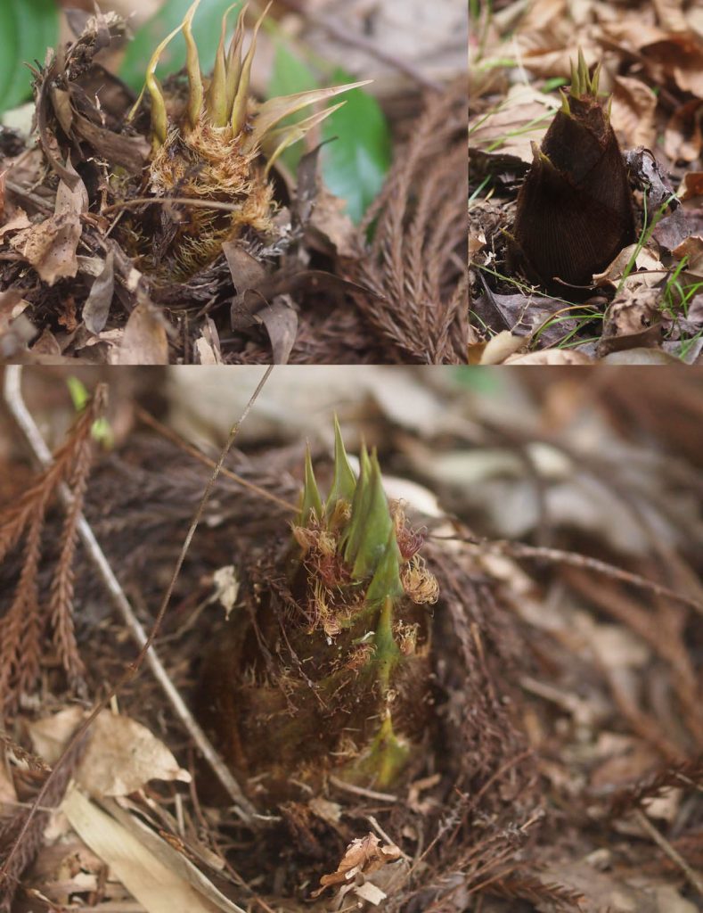 一年経ってタケノコの出現ですが、まだまだ領地への竹の侵略は続きます。昨年にタケノコが領地近くに出てきた先兵を見逃してしまい、その後大きく生長し占拠していている竹(孟宗竹)を、武力行使により3本ほど切り倒しました。倒しても他の木に引っかかり、短い長さに切って整理(復興整備?)するのに苦労します。それでもどこかの国のように侵入を止めません。防衛は実り無き辛い作業です。先日も領地に侵入し、ちょっと見落としていたタケノコがありました。掘り出して、友人に冗談交じりで送ろうと先端を切っても箱に入りませんでした。7kg近くもありました。ちょっと油断して気を許すと、敵は勢力を増大して攻めてきます。ここのタケノコは、石が多くほとんど土がない浅いところから出てきて、地中部分の可食部が少ないので、一見育ちすぎたタケノコのようですが十分食べられます。でも捨てました。