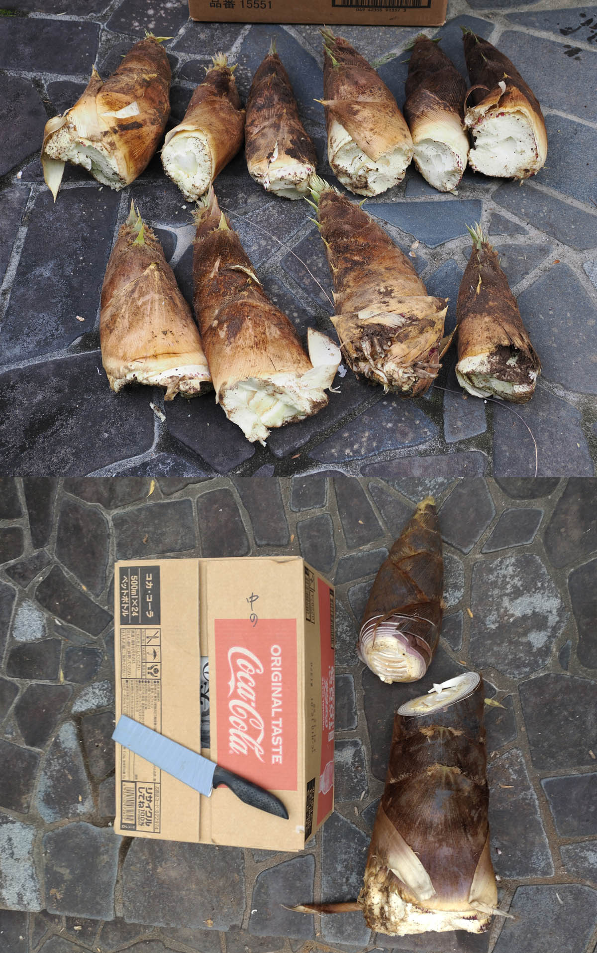 一年経ってタケノコの出現ですが、まだまだ領地への竹の侵略は続きます。昨年にタケノコが領地近くに出てきた先兵を見逃してしまい、その後大きく生長し占拠していている竹(孟宗竹)を、武力行使により3本ほど切り倒しました。倒しても他の木に引っかかり、短い長さに切って整理(復興整備?)するのに苦労します。それでもどこかの国のように侵入を止めません。防衛は実り無き辛い作業です。先日も領地に侵入し、ちょっと見落としていたタケノコがありました。掘り出して、友人に冗談交じりで送ろうと先端を切っても箱に入りませんでした。7kg近くもありました。ちょっと油断して気を許すと、敵は勢力を増大して攻めてきます。ここのタケノコは、石が多くほとんど土がない浅いところから出てきて、地中部分の可食部が少ないので、一見育ちすぎたタケノコのようですが十分食べられます。でも捨てました。