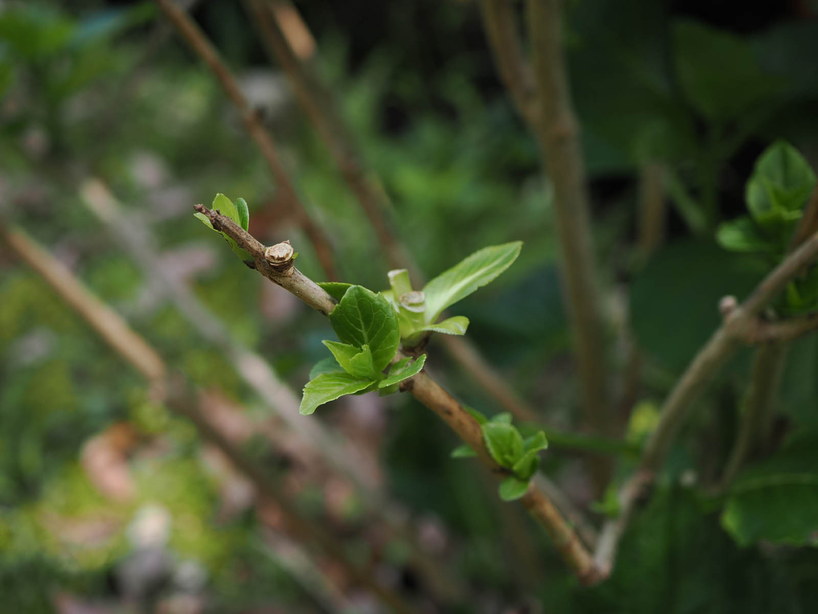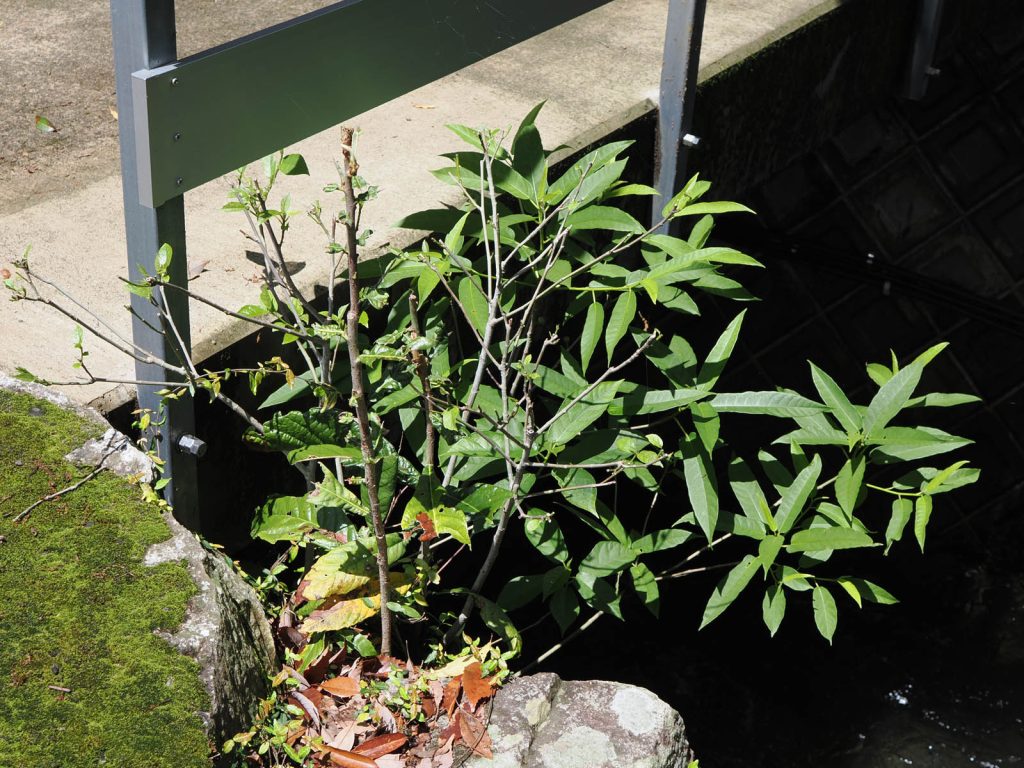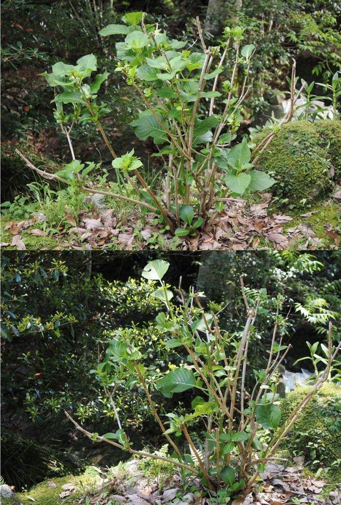 我が家の玄関は橋を渡り二つの物置小屋の脇を通って、15mほど入ったところにあります。敷地は橋のかかった川までですので、入口は橋ということになります。橋を渡り切ったところに植えたホンアジサイとウズアジサイが鹿に食われたことは昨年報告しました。でも、いまだに橋を渡ってシカが侵入してくるようです。進入口に近いこれら2種類のアジサイは今年は食われた兆候がありませんが、葉が小さく食われた影響がまだ続いています。