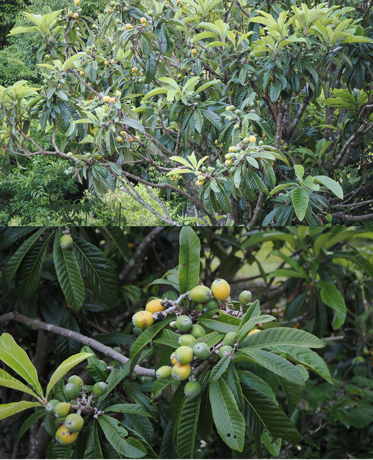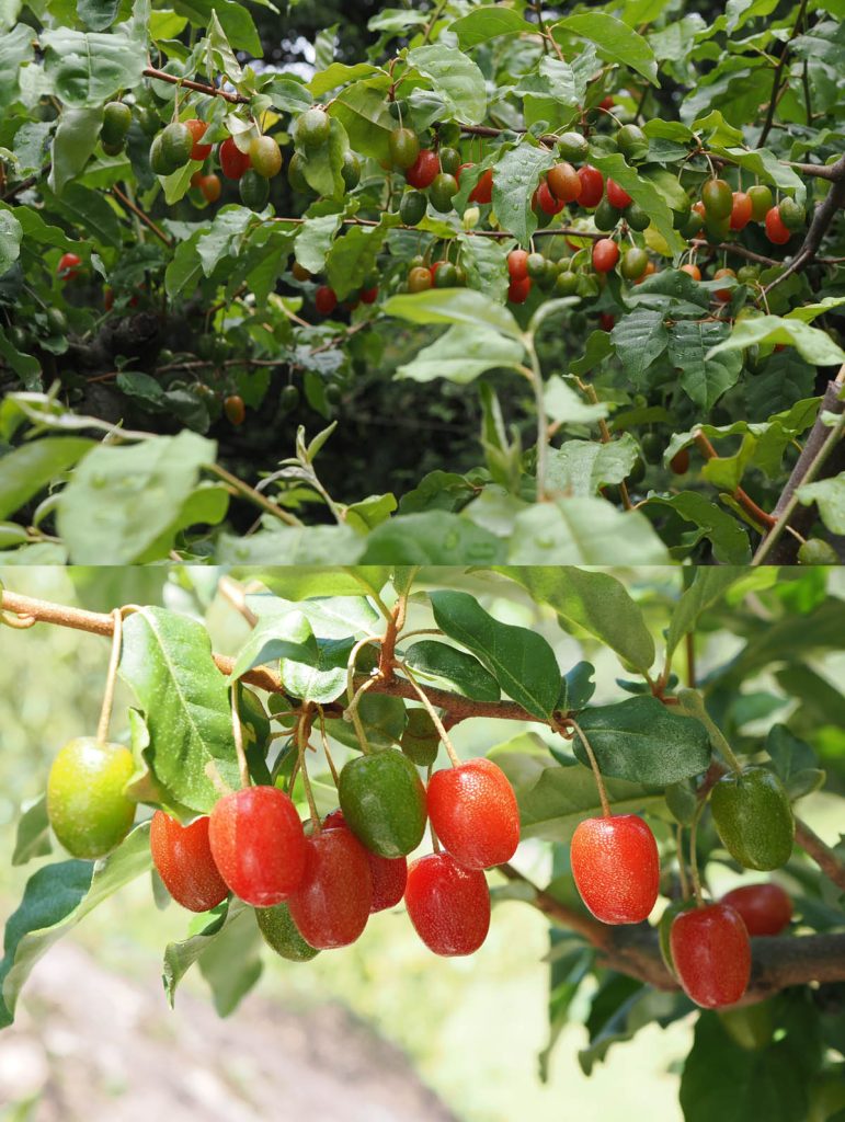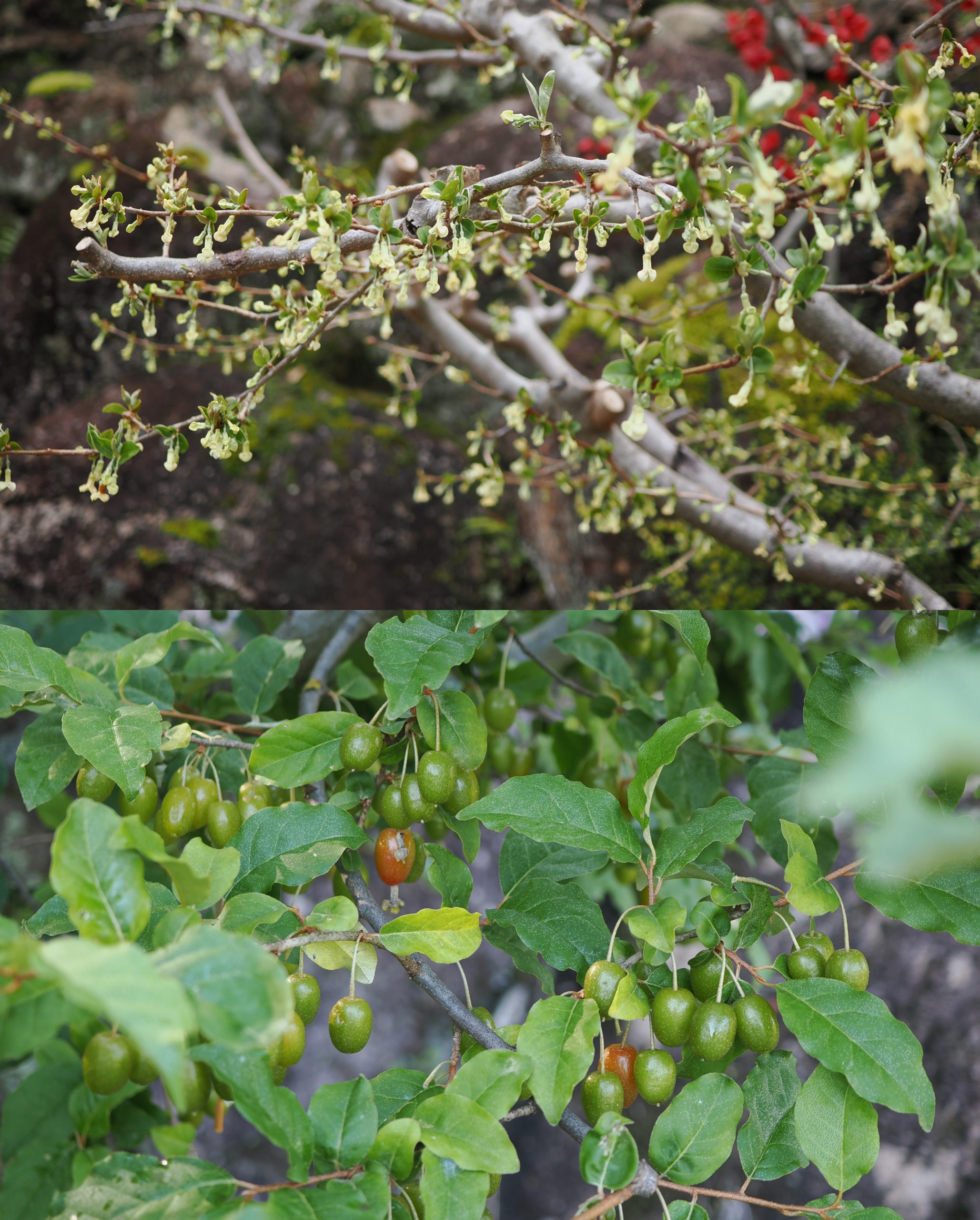 3月の花(上)と5月に入って実が熟し始めたビックリグミ(下)