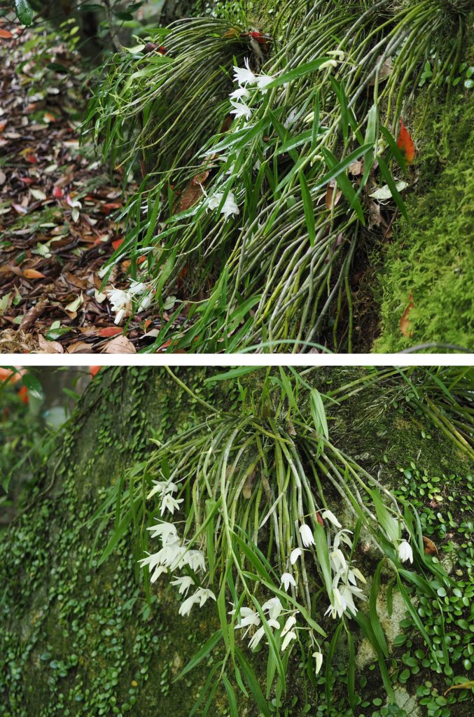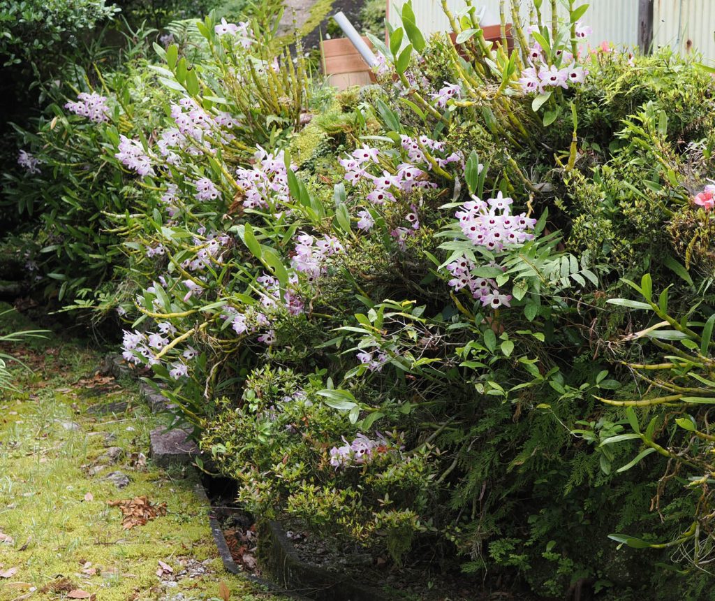 今年も玄関横の石垣に群生する蘭(デンドロビウム)が、もう蕾があまり残っていないので満開を迎えたようです。例年はカバー写真のように咲くのですが、今年は花が少ないようです。一方、この場所より奥まったさらに日陰の岩の上では、セッコク(これもデンドロビウムの一種だが野生種)がますます株を広げ、沢山の花をつけています。これら豪華な花の盛衰を毎年見ることで、自然界の変動を身に感じることができるのではないでしょうか。ここのデンドロビウムが咲く場所は、日陰なので他の場所より遅く開花します。今まで沢山の場所に移植しました。陽当たりの良いところでも良く育ち早く開花しています。そのため、様々な場所で、もともと開花期間は長いのですが、さらに長い期間花を見られるようになりました。また石垣から芸術的?に咲く花もあるので悦に入っています。昨年の7月に○○さんから違う種類のデンドロビウムとフウランをいただき、我が地に移植しました。このデンドロビウムも栽培品種のようで、沢山の種類から名前を決めることは出来ません。そこで○○デンドロビウムとして区別することにしています。陽当たりの良いところに移植したので、今年の4月中旬に一番早く開花しました。乾燥するところなので、今後が少し心配です。フウランは昨年7月、開花した株もあったので、良い匂いを漂わせていました。柿の木とウバメガシの日陰に移植したのですが、新しい根が出てきているので活着したようです。でも葉の生長が見られません。今年も良い匂いの花を咲かせるか心配です。特に柿の木に移植した一番大きな株は、柿泥棒(アライグマ)に踏み荒らされたので・・・・。