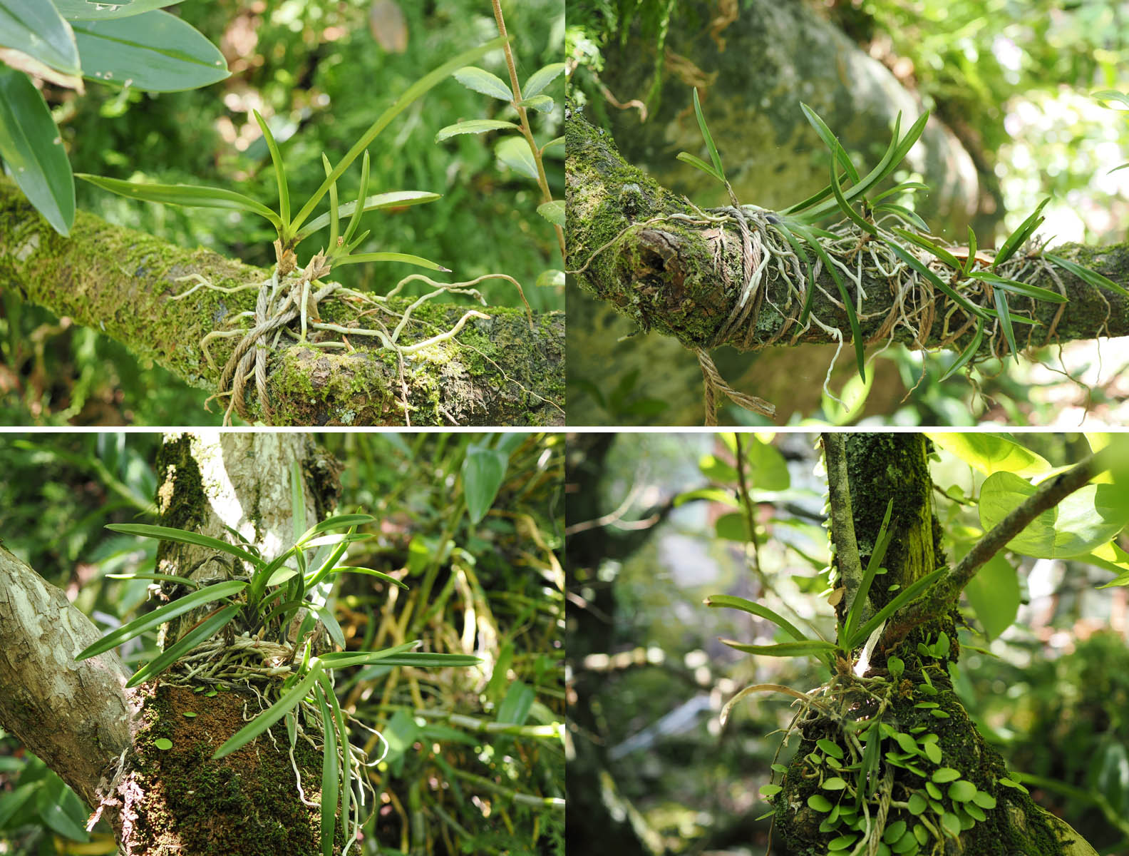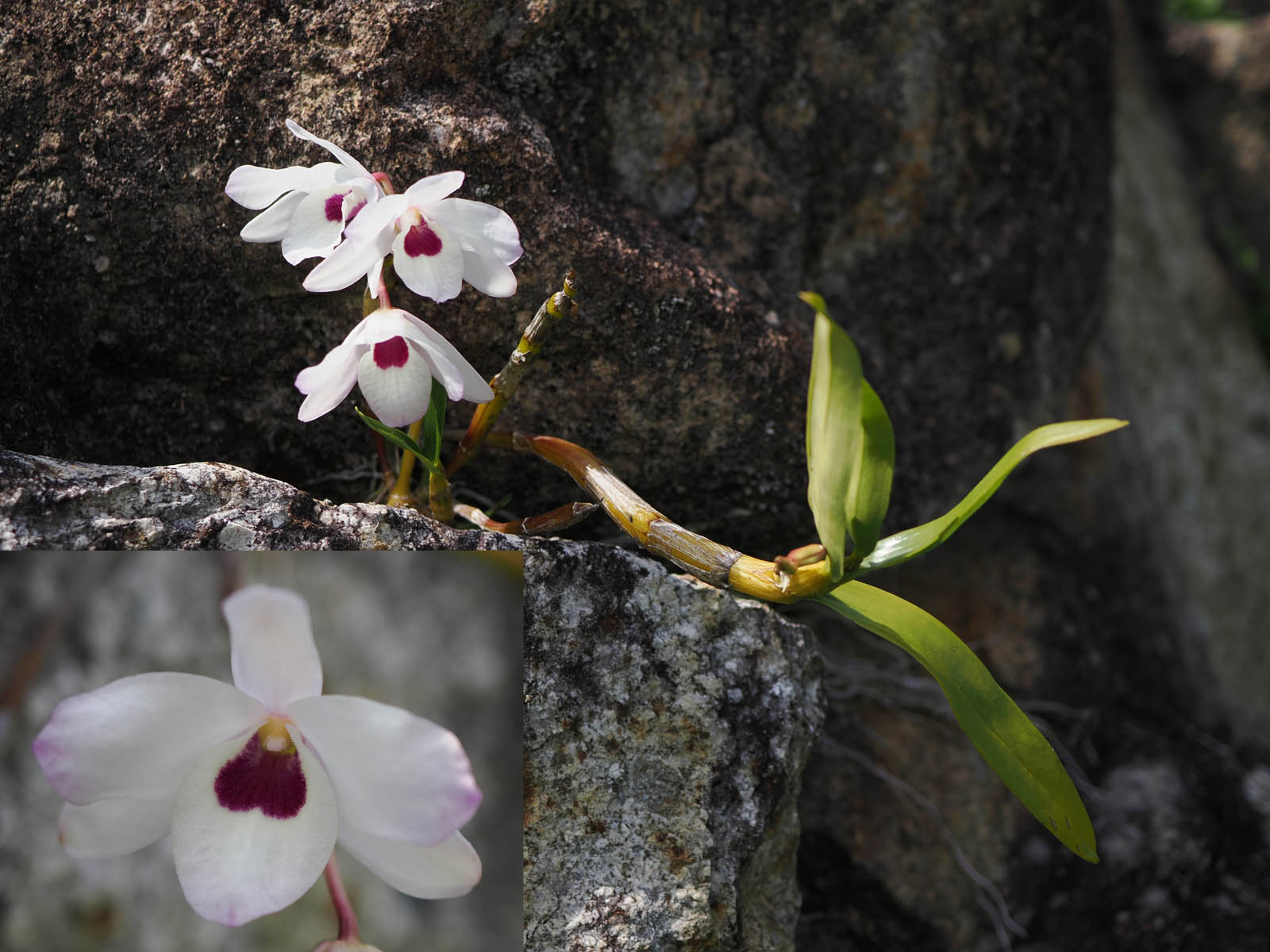 今年も玄関横の石垣に群生する蘭(デンドロビウム)が、もう蕾があまり残っていないので満開を迎えたようです。例年はカバー写真のように咲くのですが、今年は花が少ないようです。一方、この場所より奥まったさらに日陰の岩の上では、セッコク(これもデンドロビウムの一種だが野生種)がますます株を広げ、沢山の花をつけています。これら豪華な花の盛衰を毎年見ることで、自然界の変動を身に感じることができるのではないでしょうか。ここのデンドロビウムが咲く場所は、日陰なので他の場所より遅く開花します。今まで沢山の場所に移植しました。陽当たりの良いところでも良く育ち早く開花しています。そのため、様々な場所で、もともと開花期間は長いのですが、さらに長い期間花を見られるようになりました。また石垣から芸術的?に咲く花もあるので悦に入っています。昨年の7月に○○さんから違う種類のデンドロビウムとフウランをいただき、我が地に移植しました。このデンドロビウムも栽培品種のようで、沢山の種類から名前を決めることは出来ません。そこで○○デンドロビウムとして区別することにしています。陽当たりの良いところに移植したので、今年の4月中旬に一番早く開花しました。乾燥するところなので、今後が少し心配です。フウランは昨年7月、開花した株もあったので、良い匂いを漂わせていました。柿の木とウバメガシの日陰に移植したのですが、新しい根が出てきているので活着したようです。でも葉の生長が見られません。今年も良い匂いの花を咲かせるか心配です。特に柿の木に移植した一番大きな株は、柿泥棒(アライグマ)に踏み荒らされたので・・・・。