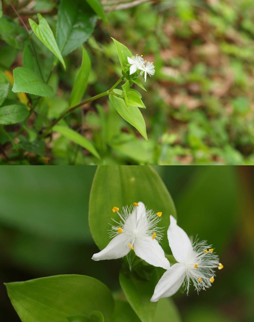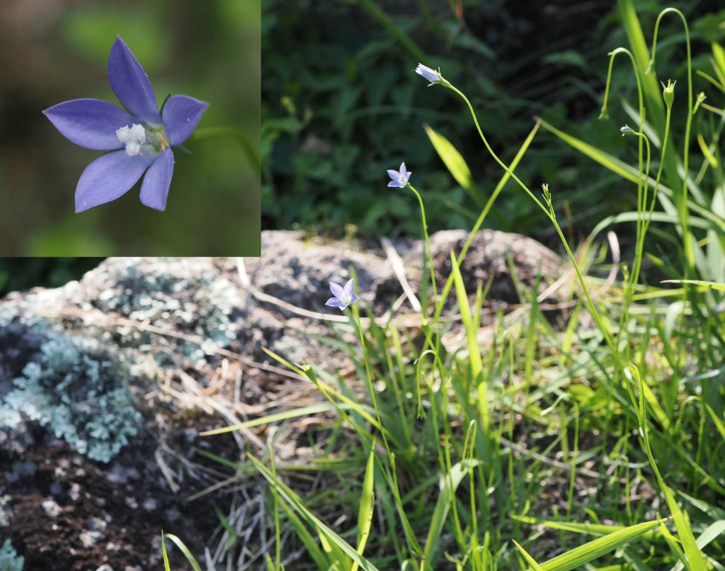 今年最初の草刈りへ行く道(あかみち「赤道:細い里道」)すがら、小さいながら綺麗な花を見つけました。4月初めのことでした。キキョウの花によく似ていてるのでその仲間ではないかと見当をつけ調べると、その名もズバリ、キキョウソウ。ヒナキキョウソウというのもありよく似ていますが、いくらかの点で異なっています。その後草刈りした畑で、陽当たりの良い場所に沢山見ることが出来るようになりました。一方、石垣と納屋の間の陽当たりがあまり良くない場所には、前種と同じ時期に、白い綺麗な花が見られるようになりました。今度は花では無く、葉がツユクサに似ていたので、それを手がかり検索すると、トキワツユクサ。いずれの種類も6月の中頃にはほとんど花が見られなくなりました。小さいながら綺麗な花で気に入っているのですが、どちらも外来種。そんな中で、花期が少し遅いようですが、昨年秋に紹介したヒナギキョウ(ヒナキキョウソウではありません)もつつましく花を咲かせていました。これは在来種。