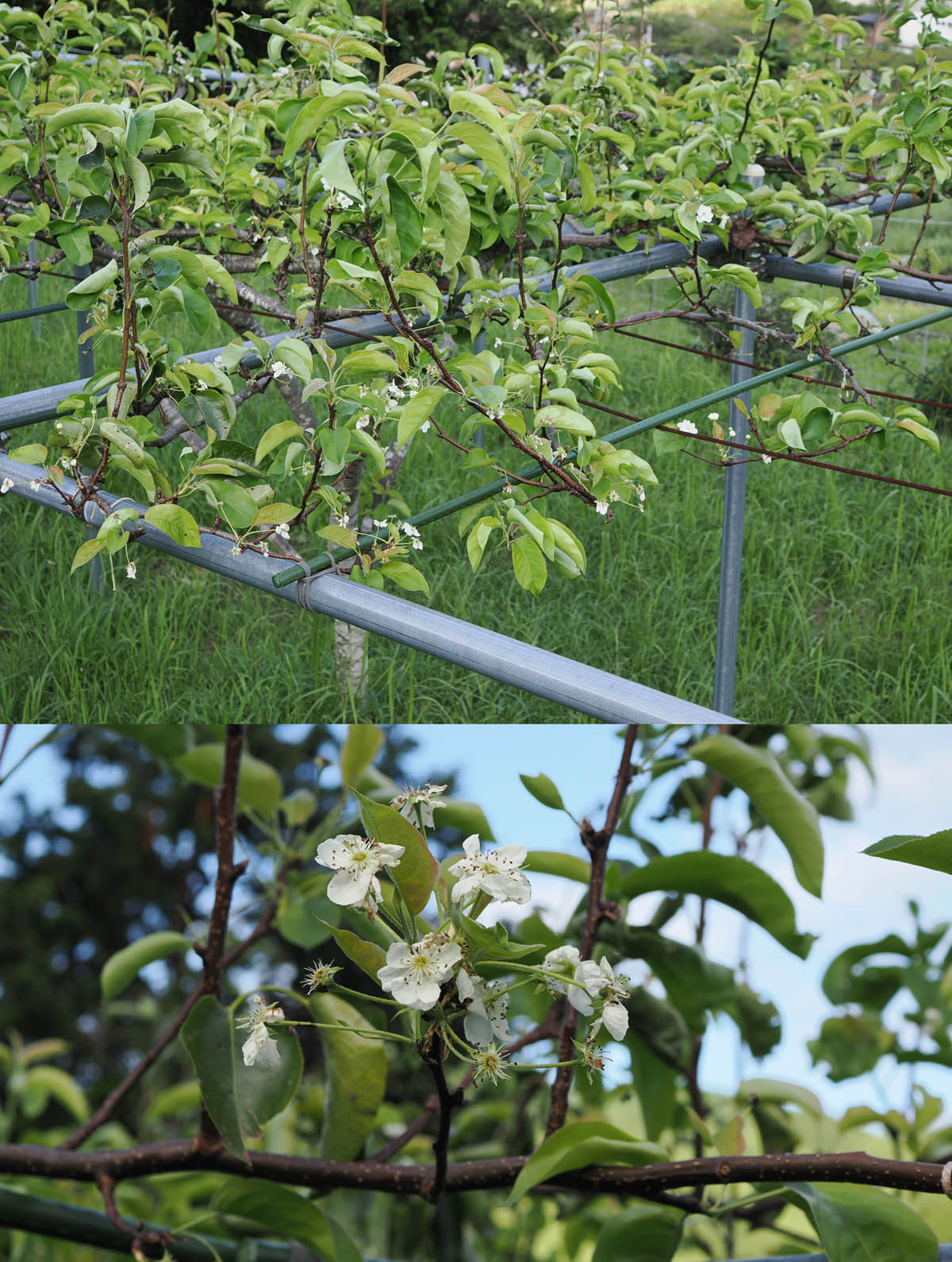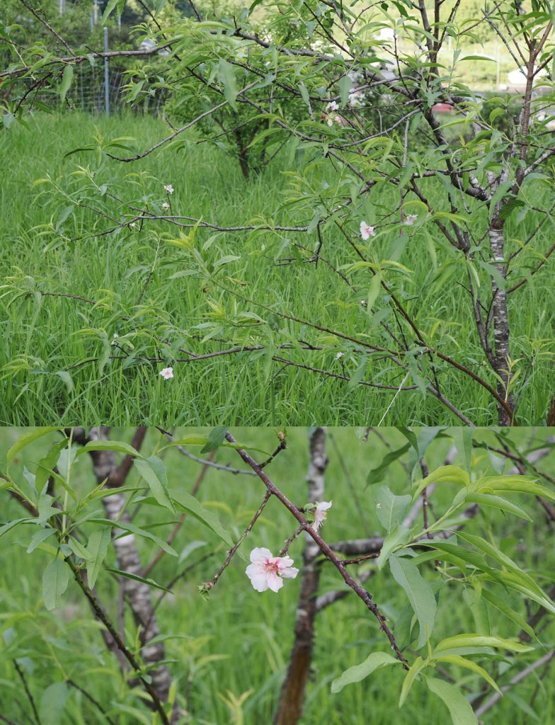 ナシ、アーモンド、サクランボが花をつけました。狂い咲きです。台風7号の強風で葉をたくさん落としたためと思われます。ナシは幸水、豊水、長十郎と3種類を植えていますが、前2種が花を咲かせ、葉があまり落ちていない長十郎には花がありません。アーモンドの花はチラホラ。サクランボは暖地という品種で1輪だけ見つけました。