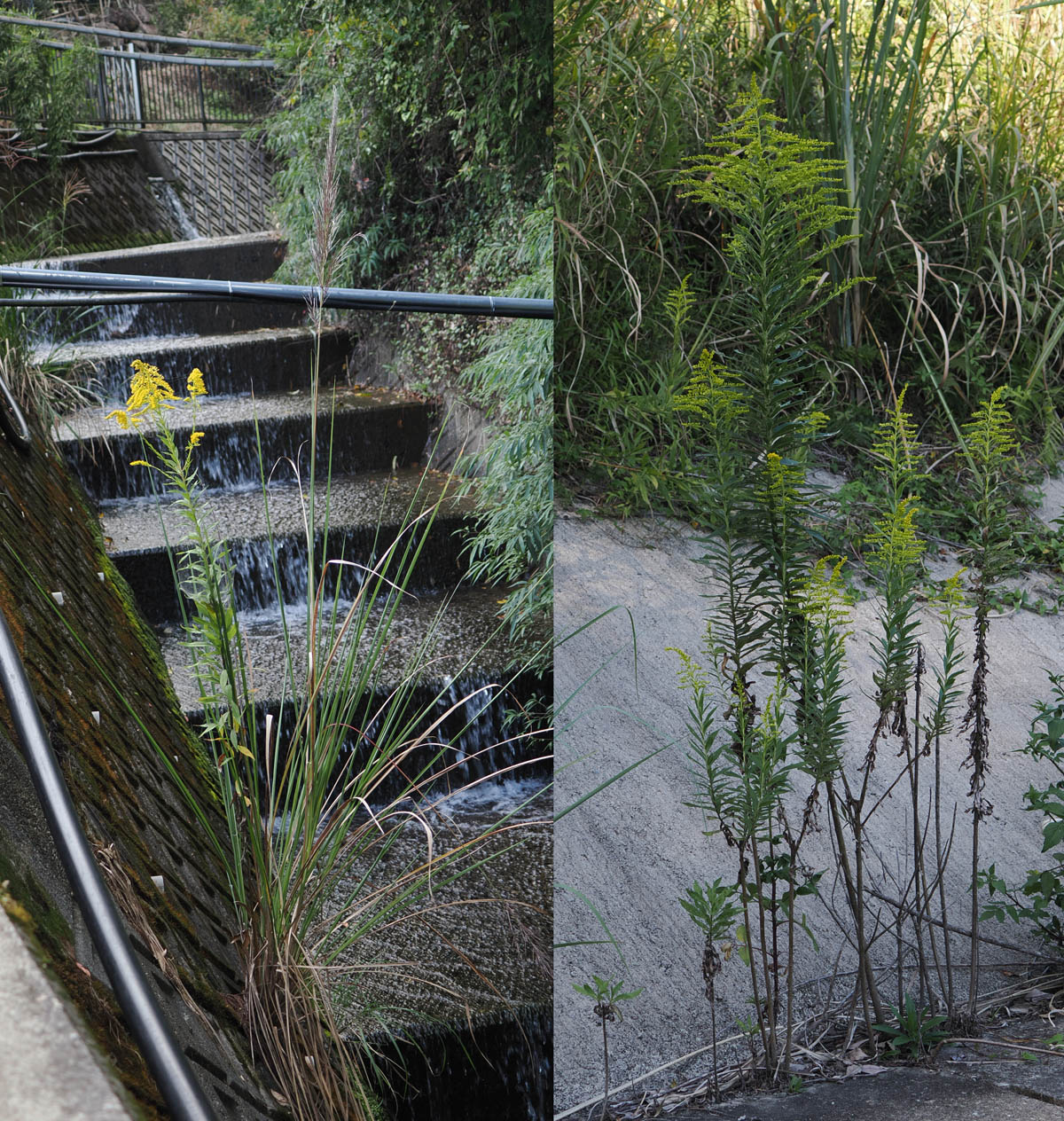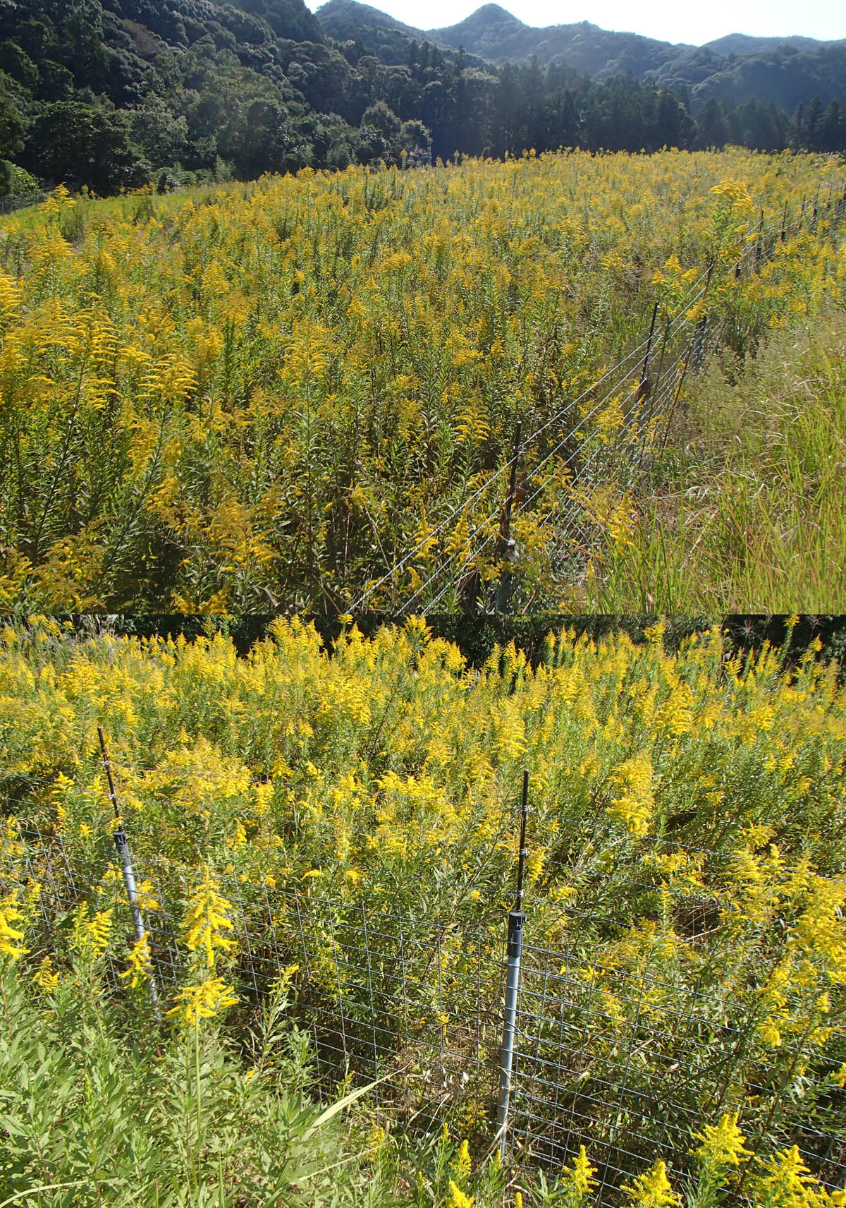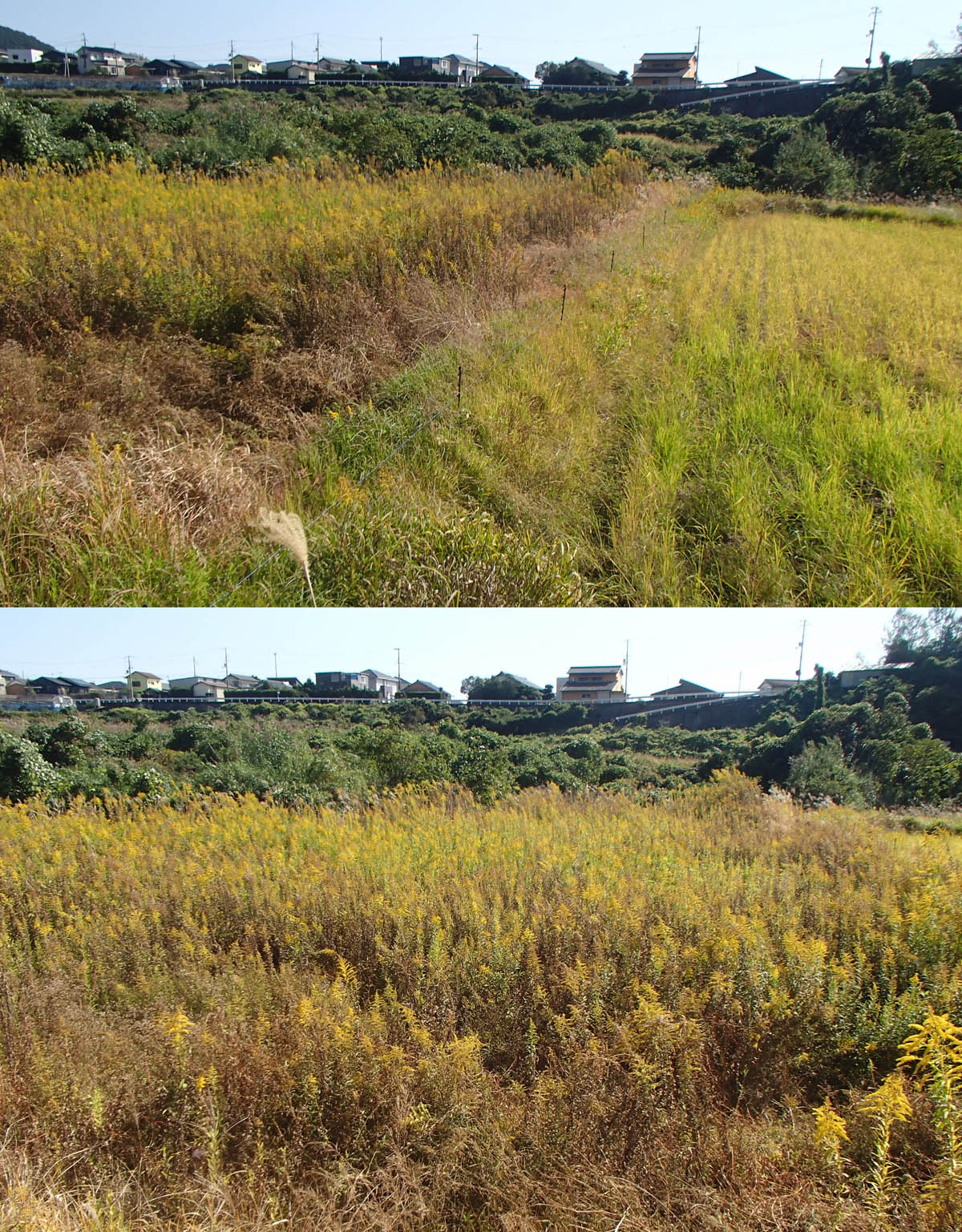 我が家周辺は山が迫っているので、結構急な斜面に耕作地があります。昔は棚田として利用されていましたが、今はほどんど田圃として利用されていません。以前報告したように、大部分が耕作放棄地となっているか、野菜の自家消費用の畑になっています。ここのような地域から離れて、海岸近くから内陸にかけて比較的平地が広がるところでは、まだ稲作が多く行われています。先月、この内陸側に入った場所を車で通過する道すがら、一面セイタカアワダチソウの黄色い花が、多くの田圃の区画で占有されているのに気づきました。もう何年も毎月通る道ですが、今までこのような印象を受けたことはありません。セイタカアワダチソウは、他の生物の生長を阻害する物質を出すこと(アレロパシー)が自身にはね返り、その内自滅するとも言われています。実際、田圃が耕作放棄されると数年で他の雑草で覆い尽くされて藪のようになってしまうようです。一面黄色くなった田圃は最近耕作されなくなったのは明らかです。まだ怪獣除けの電気柵が残っている場所からもうなずけます。黄色い広がりのスピードはますます加速しているようで心配になります。我が畑(棚田跡)もこの地へ来たときにはセイタカアワダチソウで覆われたところがありましたが、一年に何度も草刈りをしたらすぐに無くなりました。今は一本も生えていなく、隣を流れる川の縁石の隙間でしぶとく生きていたり、前稿で報告した道路の法面下にあるコンクリートの縁と隙間やその周辺で見かける程度です。