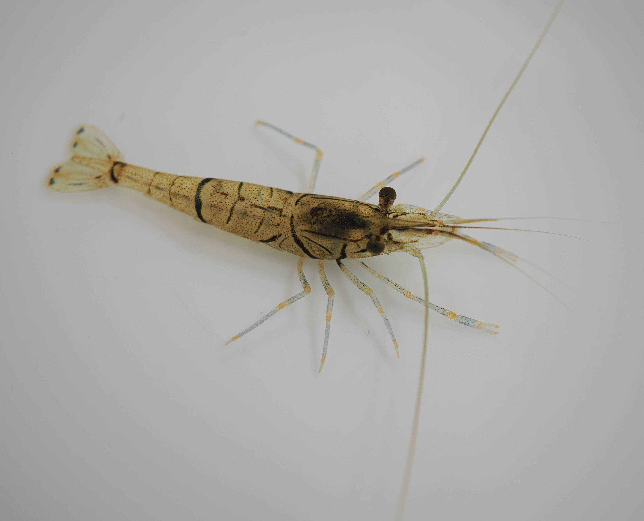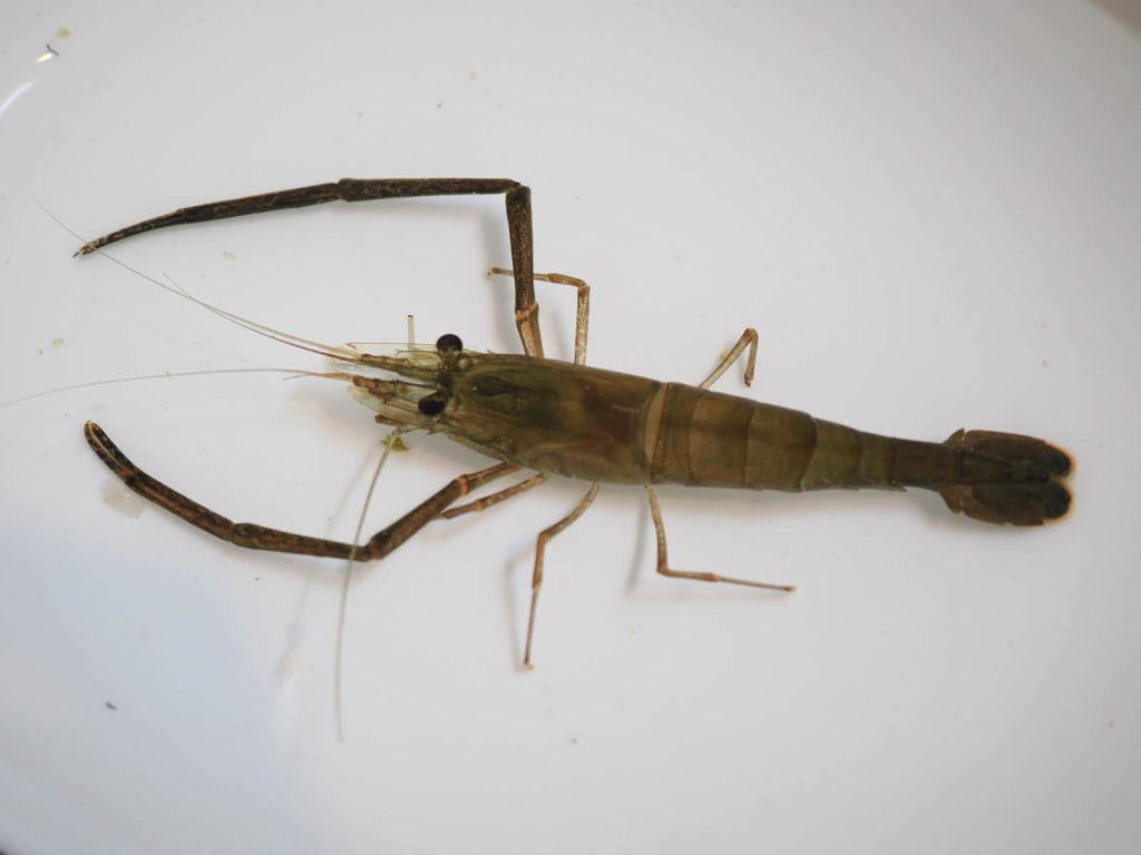 蟹籠には、他にミナミテナガエビとスジエビがかかっていました。籠の網の目合はこれらの個体より大きいのですが、引き上げるときに運良く(悪く?)引っ掛かったようです。ミナミテナガエビは、最初普通のテナガエビと思ったのですが、念のために鋏脚の剛毛の付き具合などの細部を見てミナミテナガエビと同定されました。こんなことをするのも昔の習性からですかね。