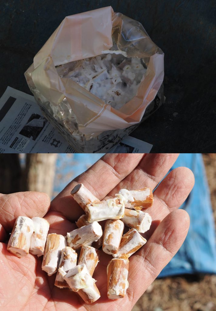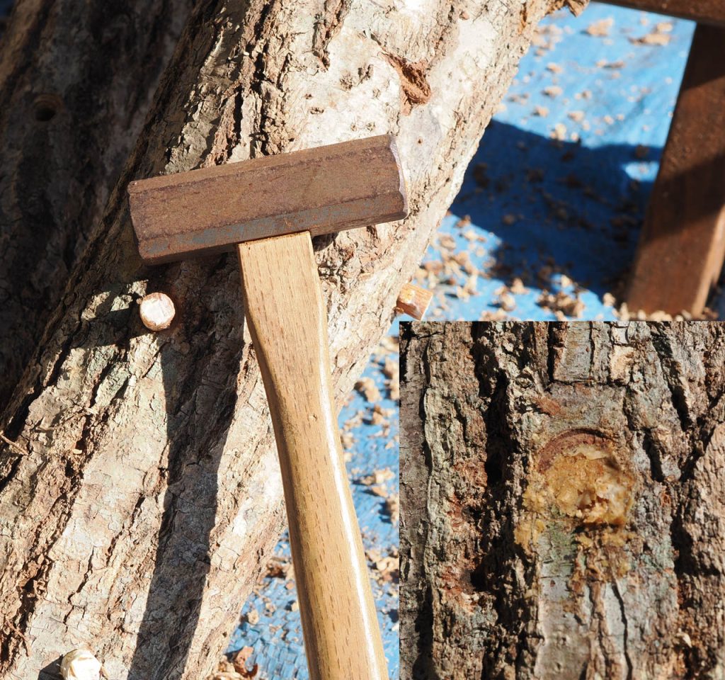先週の天気の良い日を見計らって、1mに切った楢の原木14本にシイタケ菌の接種をしました。原木は昨年の2月下旬に友人からいただいたのですが、時期が遅かったので今年まで保管しておいたものです。そのため原木として乾燥しすぎかもしれません。結局、今年も植え付けが遅くなってしまいました。手順として、直径と深さが一定になる専用ドリルビットを電動ドリルに取り付け、原木1本につき36個の穴を開け、そこに種駒を金槌で打ち込みました。合計36×14=504個の種駒を接種したことになります。その後、接種した原木にたっぷり水をかけ、林内の日陰に水平に2段に重ねて並べ、その上に段ボールを敷き、外側を完全にブルーシートで覆いました。いわゆる仮伏せと言う作業で、4月下旬頃までこの状態にしておくと、原木内に菌糸が蔓延したほだ木(シイタケが発生する状態になった木)ができあがります。そうすると、本伏せといって、ほだ木を立てかけてシイタケがでてくるのを待つ、と言うことになります。