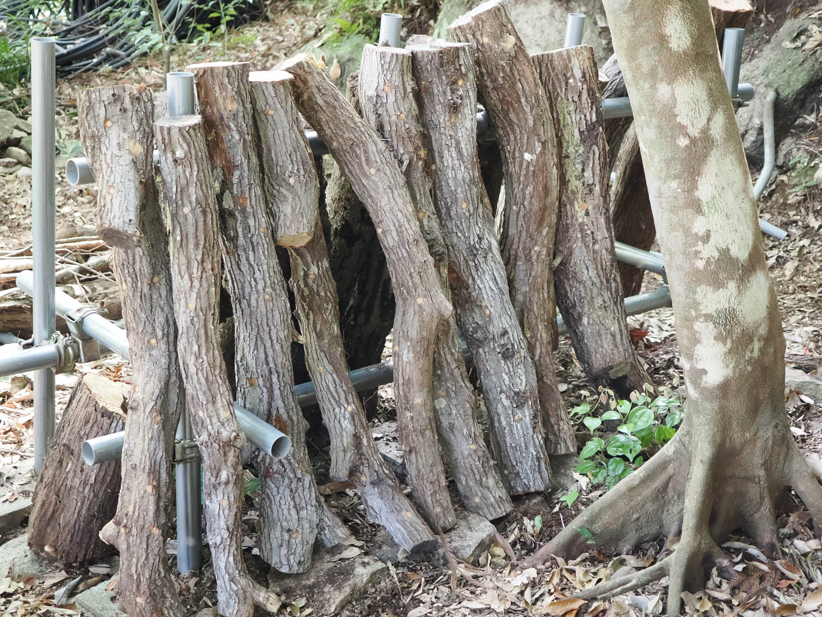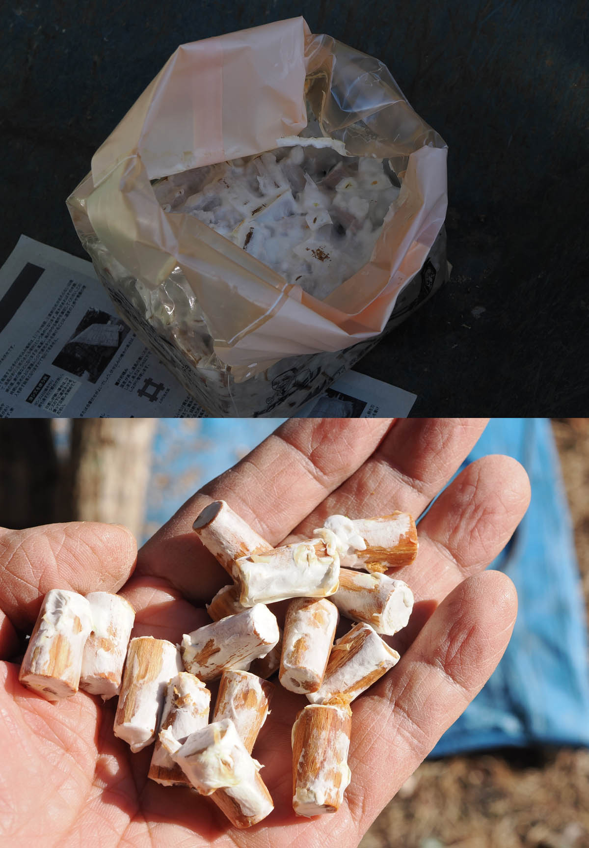 昨年もほだ木を作りましたが、今年と同様に原木の切り出しから、菌の接種まで長く開いてしまい(実を言うといつ切り出したか分からない古い木)、原木が乾燥しすぎていたのは明らかで、シイタケが出てくる気配があまり見られません。結構いい加減に作っていますが、今まで少しは出てくるので、大きなものを焼いて食べるのを楽しみにしています。でも、季節になり雨が降った後に一斉に出てきたときは食べきれず、干しシイタケを作ったりしています。採るのを忘れてお化けシイタケになることもあります。