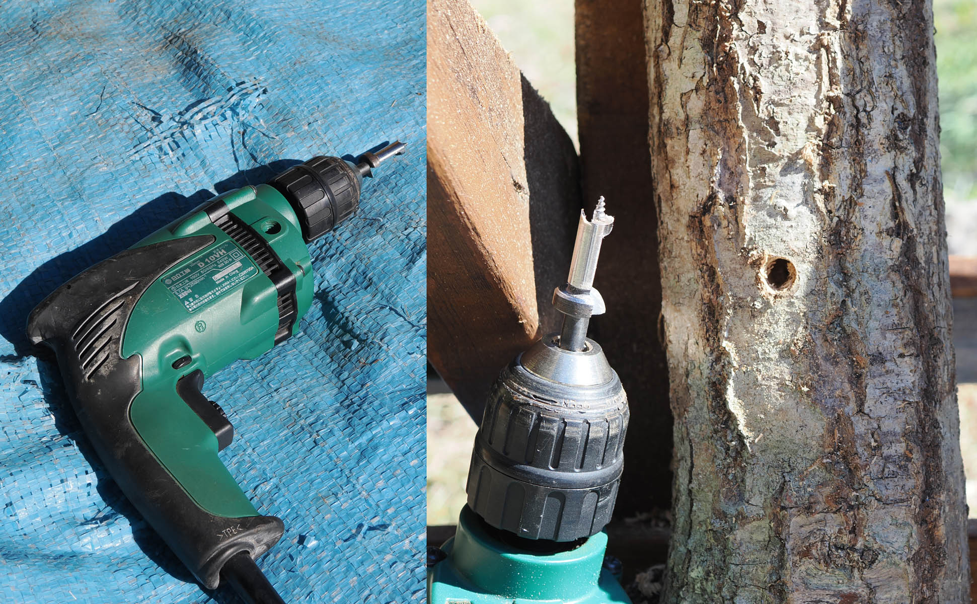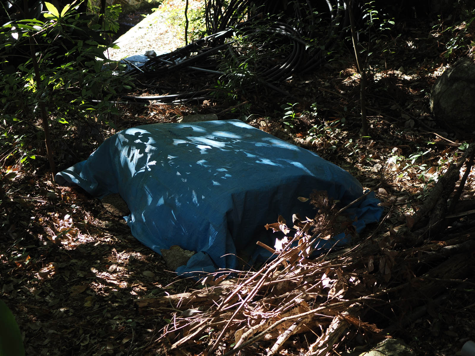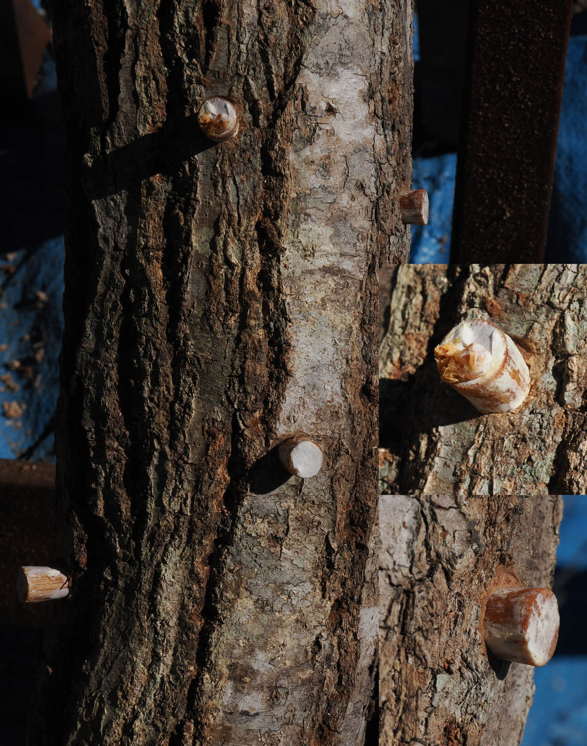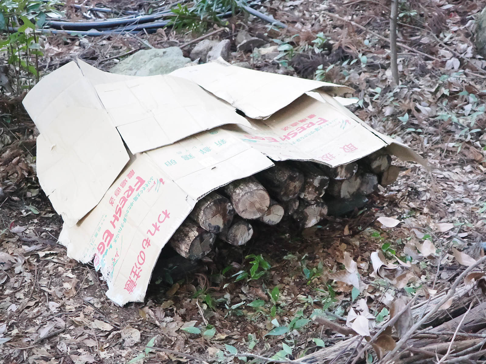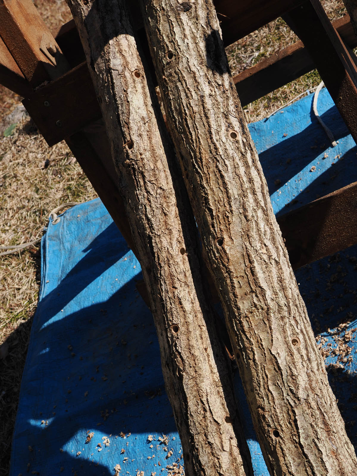 先週の天気の良い日を見計らって、1mに切った楢の原木14本にシイタケ菌の接種をしました。原木は昨年の2月下旬に友人からいただいたのですが、時期が遅かったので今年まで保管しておいたものです。そのため原木として乾燥しすぎかもしれません。結局、今年も植え付けが遅くなってしまいました。手順として、直径と深さが一定になる専用ドリルビットを電動ドリルに取り付け、原木1本につき36個の穴を開け、そこに種駒を金槌で打ち込みました。合計36×14=504個の種駒を接種したことになります。その後、接種した原木にたっぷり水をかけ、林内の日陰に水平に2段に重ねて並べ、その上に段ボールを敷き、外側を完全にブルーシートで覆いました。いわゆる仮伏せと言う作業で、4月下旬頃までこの状態にしておくと、原木内に菌糸が蔓延したほだ木(シイタケが発生する状態になった木)ができあがります。そうすると、本伏せといって、ほだ木を立てかけてシイタケがでてくるのを待つ、と言うことになります。