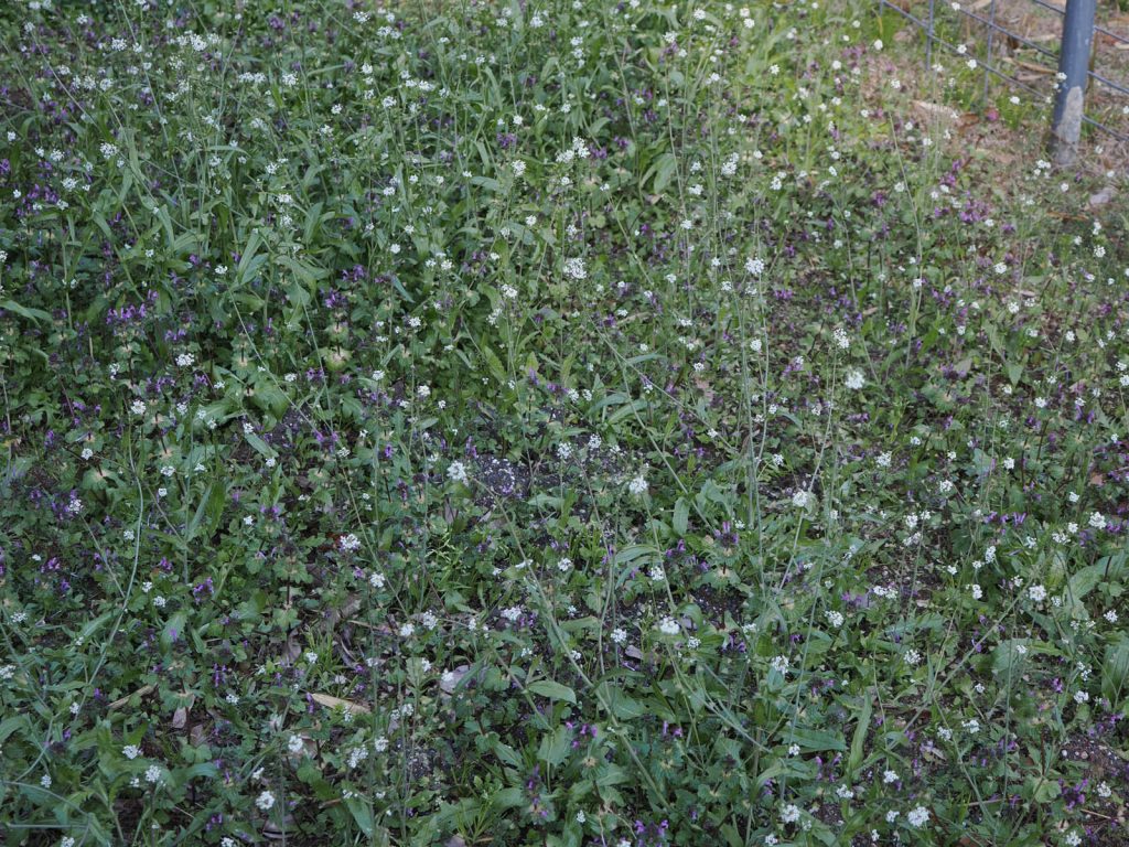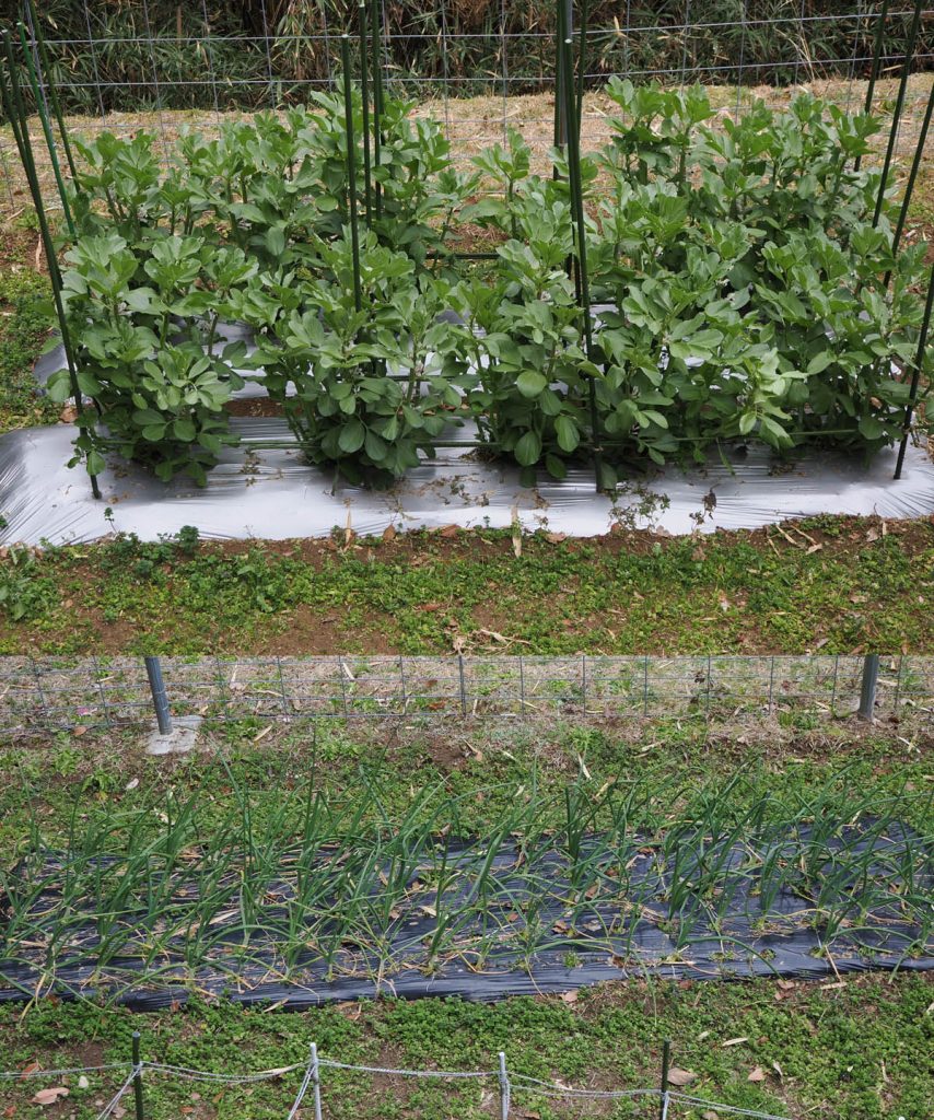草刈り前に雑草の中に、ミズナとチンゲンサイ、それらの雑種あるいは先祖返り(以前の記事を見て下さい)が所々に生えていたので、収穫して食べました。一昨年に種がこぼれた野菜です。野菜といえども結構しぶとく生えてくるものだと感心しています。タマネギとソラマメは順調に育っているようです。これを見ると、少しは野菜作りが上達しているのかなと思いながら、今年の収穫が楽しみにしています。両野菜ともマルチをして雑草を防止していますが、周辺で大きく育ったホトケノザとナズナが覆ってきていたので、草刈機で刈りとりました。驚くべき生育力です。