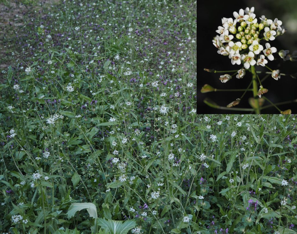 昨年の9月中旬に、家の一番近くにある畑を施肥・耕耘・整地し、一部にタマネギとソラマメを植えました。残りの部分は来年にもジャガイモを植えようと思いそのまま放置しておきました。よく言えば休耕地です。自家消費のためには野菜を作りすぎるので、冷凍などの保存がきく野菜以外はたくさん作らないようにしています。けれども種を蒔くとたくさん出てくるので、未だに消費しきれず、花を咲かせてしまう野菜がたくさんできてしまいます。その休耕地ですが、冬には雑草があまり生えない予想に反して、冬頃から2種の雑草、ホトケノザとナズナが目立つようになり、1月下旬には一面の花盛りです。施肥したので栄養が良いのか、暖冬(温暖化?)のためか、いずれも3月頃から花を咲かせる春の草花です。ナズナは春の七草ですが、このホトケノザは違います。2月に入り、あまりの繁茂に放っておけず草刈りをしました。まさか2月始めに草刈りをするとは思いませんでした。その後、施肥・耕耘・整地をし、一昨日に畝立てをしてジャガイモを植え付けました。