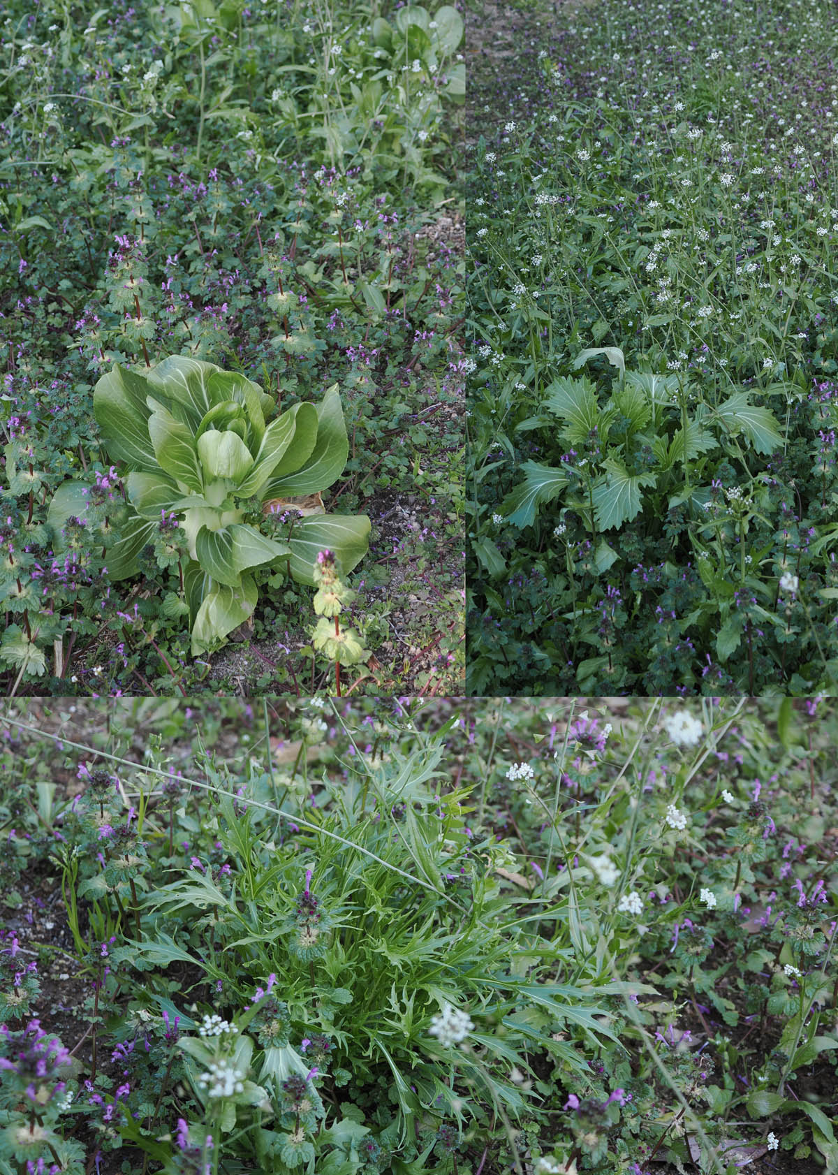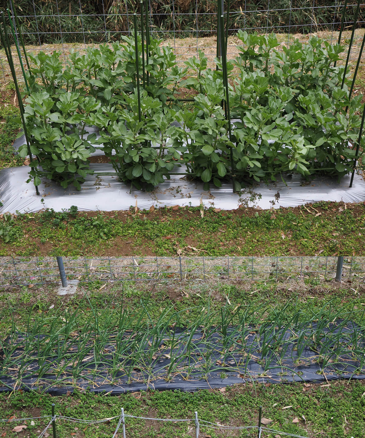草刈り前に雑草の中に、ミズナとチンゲンサイ、それらの雑種あるいは先祖返り(以前の記事を見て下さい)が所々に生えていたので、収穫して食べました。一昨年に種がこぼれた野菜です。野菜といえども結構しぶとく生えてくるものだと感心しています。タマネギとソラマメは順調に育っているようです。これを見ると、少しは野菜作りが上達しているのかなと思いながら、今年の収穫が楽しみにしています。両野菜ともマルチをして雑草を防止していますが、周辺で大きく育ったホトケノザとナズナが覆ってきていたので、草刈機で刈りとりました。驚くべき生育力です。