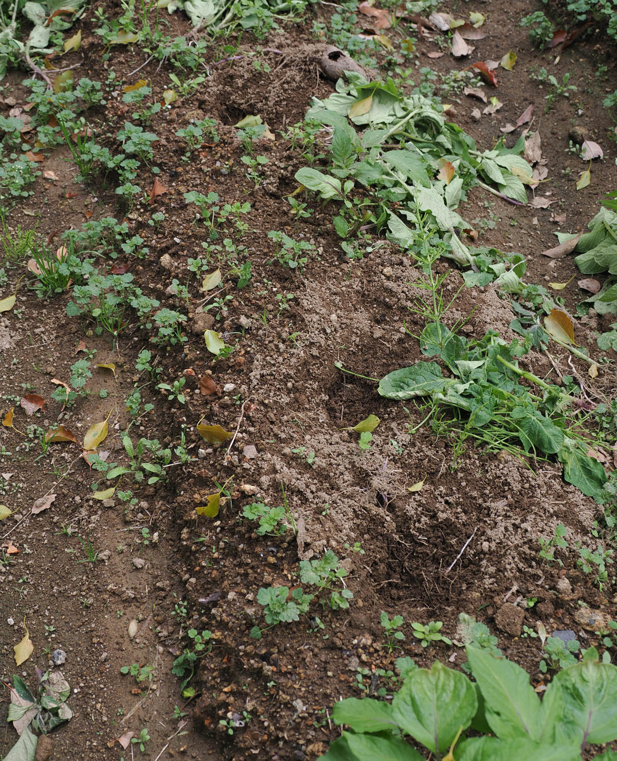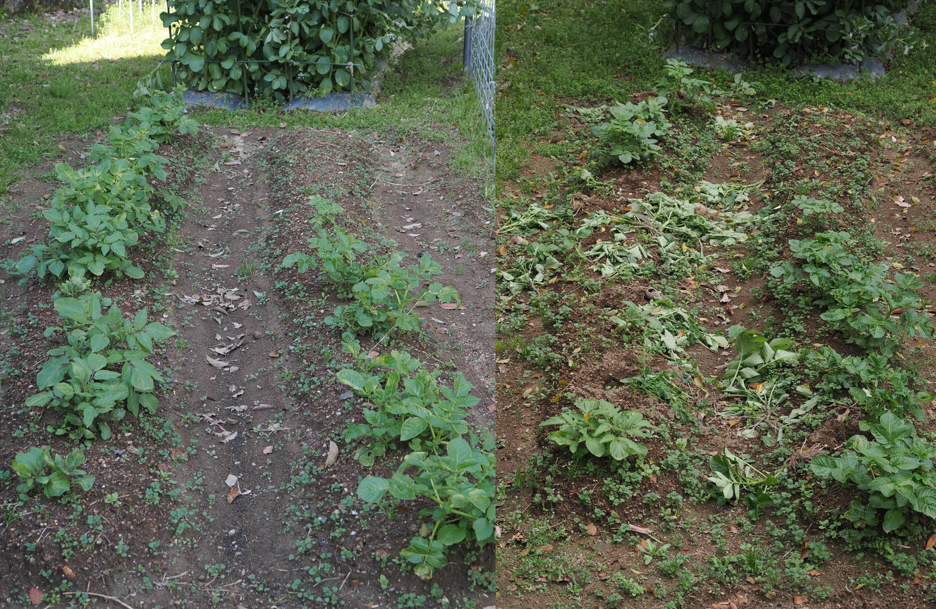 一方、近くにある畑は大被害でした。幸いソラマメはまだ花の季節で実がないのが分かっているためか、全然手を付けていません。前回荒らされたタマネギがまた同じように葉が引き千切られていました。特に酷かったのはジャガイモです。引き千切り、掘り返しています。タマネギはまだ大きくなっていませんし、ジャガイモは、芽を出し葉を広げてあまり経っていないので、まだ地下のジャガイモはできていません。試しに手当たり次第掘り返してみた、と言ったところでした。前回のように、食物を漁ったとういより、私への嫌がらせとしか思われません。