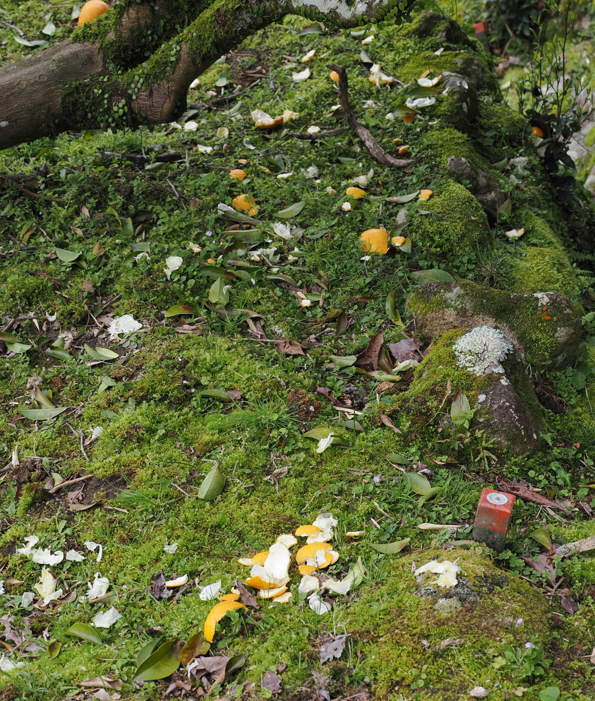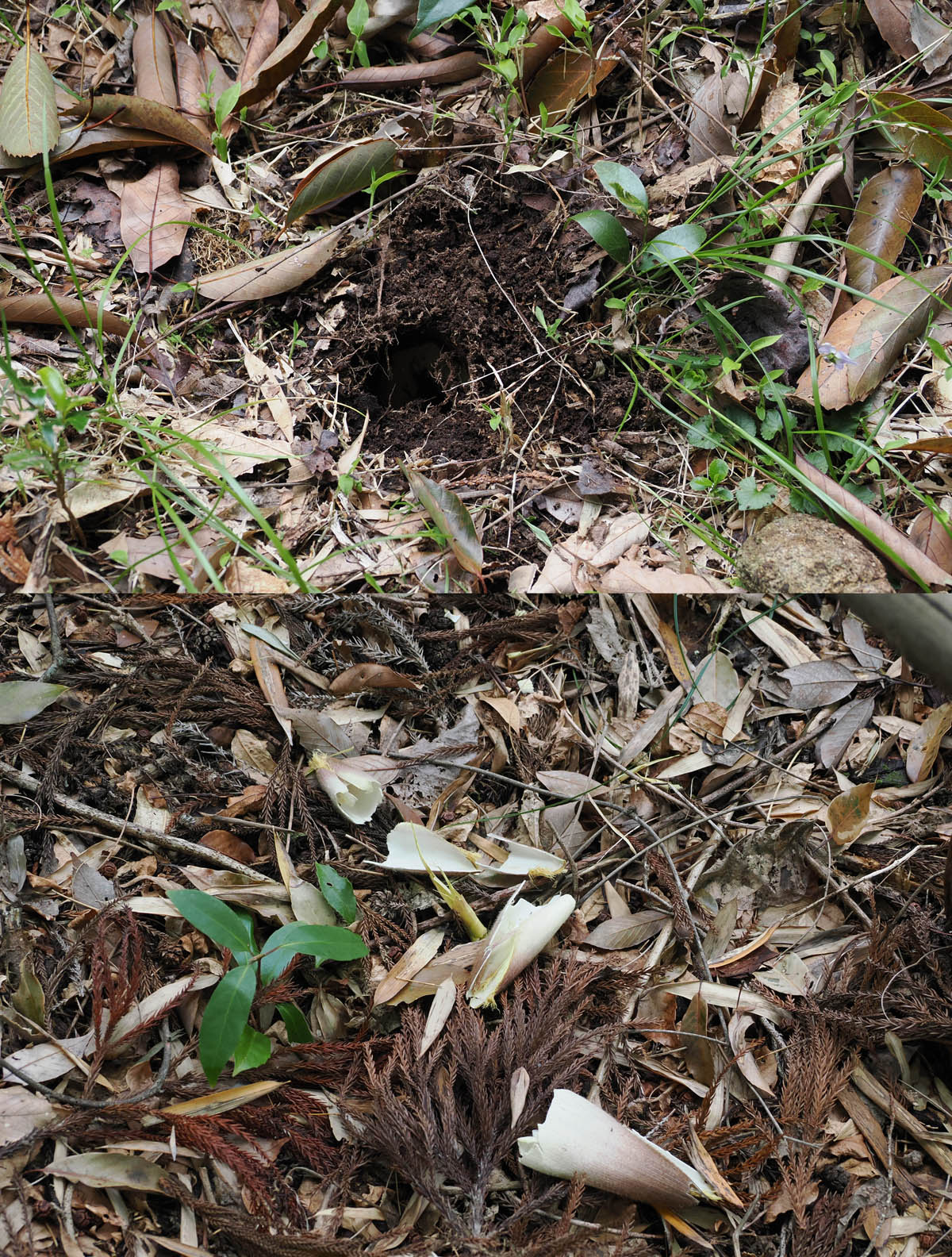 その後、下の畑から、さらにお隣さんの畑の方へ降りていくと、途中で今年初めて出たタケノコの残骸と、食い散らかしたミカンの皮が散乱していました。