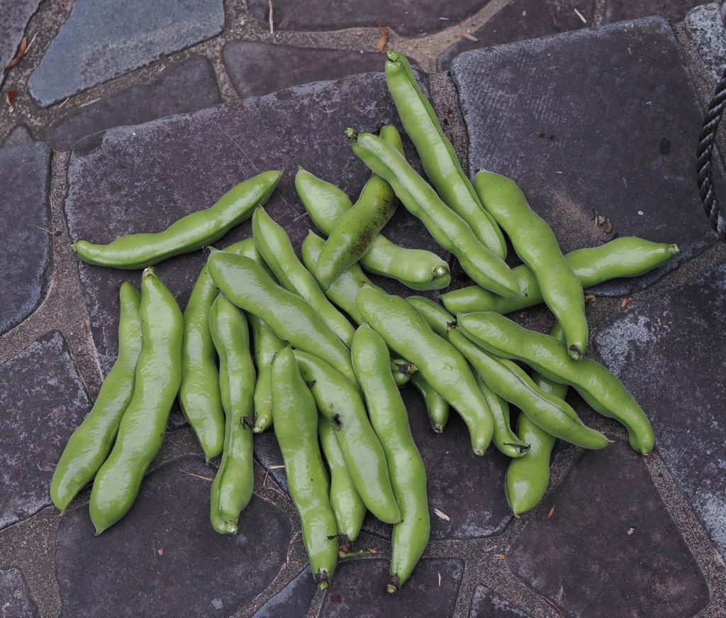今月5月始めの連休後半に友人が来ると言うことで、その2週間くらい前にソラマメを試しに食べてみました。少々若いようでしたが、柔らかく皮まで美味しくいただけました。連休には食べ頃と判断し、それまで待つことにしました。今まで何度報告することになるのでしょうか。彼らが到着する前日に食べ頃になったものが、猿に荒らされました。見かけた猿は一匹のみで、外側の株は倒れ空になった鞘が周りに散乱していましていました。怒り心頭でしたが、株が密生しているので内側には少しは食べ頃のものが残っているだろうと思って、友人が来たときに収穫してもらうことにしました。ソラマメは、下の方から順に、鞘が上を向いたものが大きくなり下向きになったものが収穫時期です。密生した株間をかき分けて食べ頃のソラマメを探して友人共々驚きました。密生した内部にも食べた鞘の山が残されていました。それまで気がつかなかったのですが、食べ頃のソラマメのほとんど全部が食べられて、残ったのは先端の若いソラマメだけになっていました。猿は食べるときには作物を引き倒して荒らしまくるのですが、どうも今回のソラマメは生育が非常によかったので、株の間に潜り込んで、そこに座り込んで(?)食べたようです。カメラで監視していたのに猿の発見が遅れたのも、そのためだと思えて仕方がありません。それでも、まだ猿が荒らしまくって枯れてしまった訳でもありませんし、先の方にはまだ未熟なものがたくさん残っていました。そこで、その後成熟して収穫できることを一途の望みにして、3週間ほと経った先日に収穫しました。またまたガッカリです。ほとんど豆が採れませんでした。