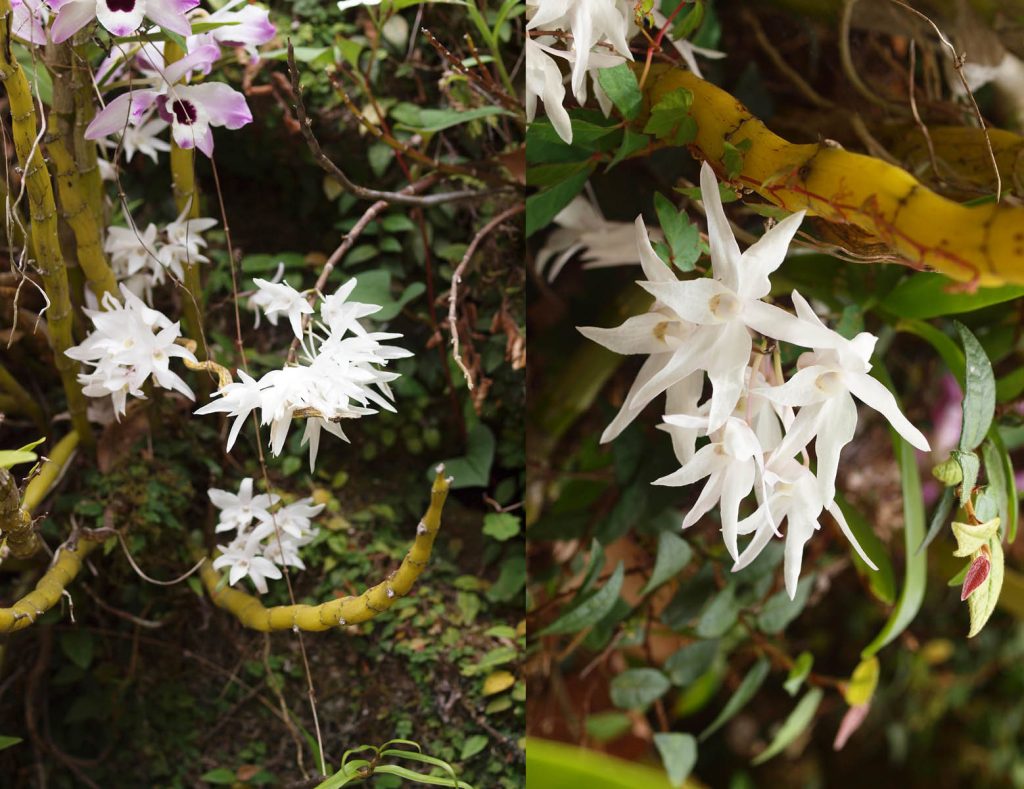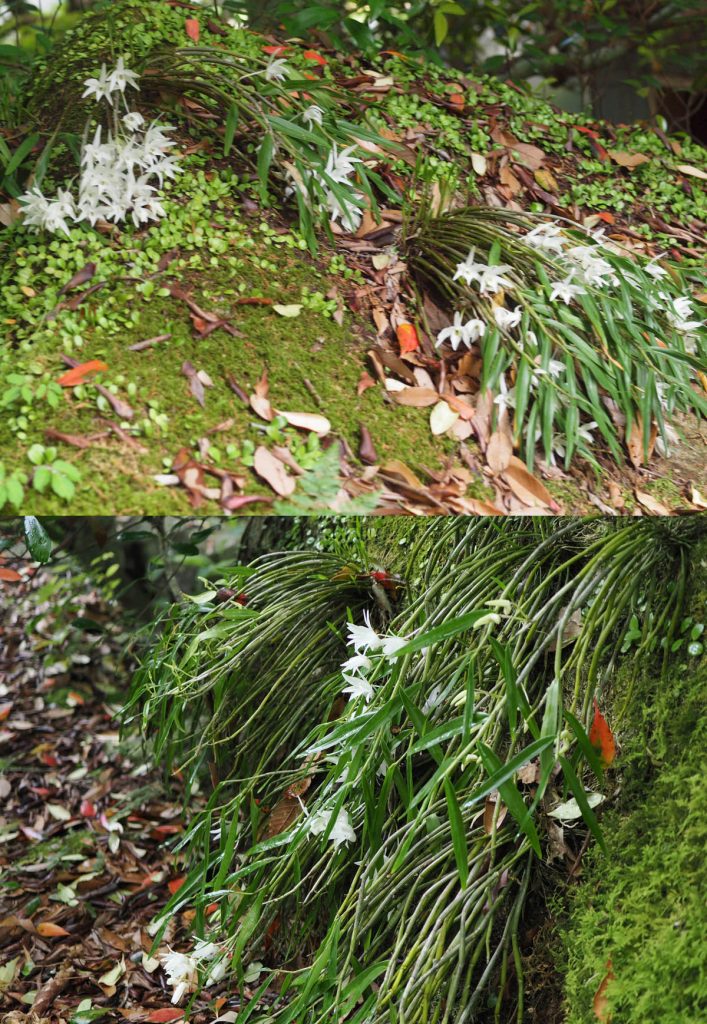 我が家の蘭、その2/7:セッコクです。この蘭も前稿のデンドロビウムが咲き誇る場所で、白い花を覗かせていました。ここではデンドロビウムと他の木やシダなどが繁茂しており、その隙間から数本の茎が伸びているだけで、花がなければほとんど気がつきませんでした。その後、いつ気がついたのか記憶にありませんが、この半日陰ながら陽が当たる場所より奥で、木(モッコク)に覆われて直射日光が届かない、大きな石の上で数株をみつけました。岩の上なので小さな苔以外には他の植物は生えていません。そのため花が咲くと目立ちます。年々株自体も大きくなり新しい株も増えてきているようです。ですが非常にゆっくりです。最近、植木としてモッコクがあまりにも大きくなったので、大幅な選定をおこないました。また、落ち葉があまりにも株を覆うので少し取り除きました。そのため少し明るくなったせいかもしれませんが、新しい芽が株の根元から以前よりたくさん出てきたようです。セッコクも正確に言えばデンドロビウムです。しかし、一般にデンドロビウムと言われて華やかに咲く種類とは違い、草体も小さく白い瀟洒な花を咲かせます。そのためかどうかは分かりませんが、セッコクは蘭の栽培でも人気があるようです。また盗採もあるようです。けっこう陽当たりが良い場所を好むと言われていますが、我が家のセッコクは日陰ですが自生であると思って(信じて)います。一般に樹上や岩の上に生えるようですが、報道されているような樹上には見られません。そのうち、良さそうな木があるので、その上に移植して増やしてみようと思っています。デンドロビウム(前稿)と違い、茎の途中から芽生え、根を出さないようなので、株を壊さないように、どのようにしようか思案中です。