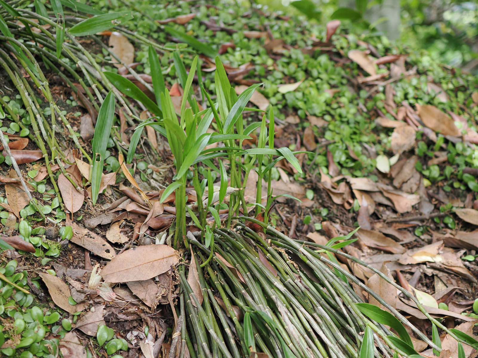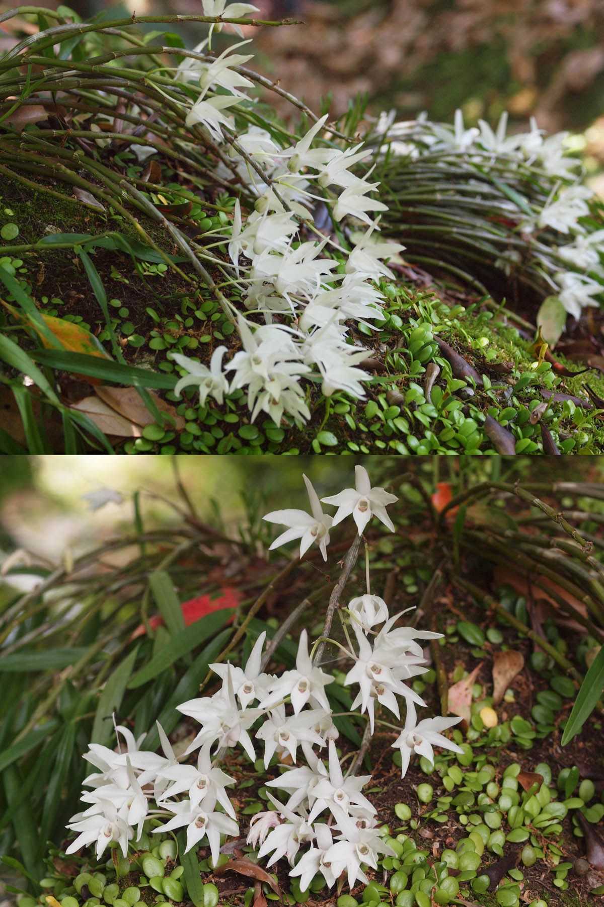 我が家の蘭、その2/7:セッコクです。この蘭も前稿のデンドロビウムが咲き誇る場所で、白い花を覗かせていました。ここではデンドロビウムと他の木やシダなどが繁茂しており、その隙間から数本の茎が伸びているだけで、花がなければほとんど気がつきませんでした。その後、いつ気がついたのか記憶にありませんが、この半日陰ながら陽が当たる場所より奥で、木(モッコク)に覆われて直射日光が届かない、大きな石の上で数株をみつけました。岩の上なので小さな苔以外には他の植物は生えていません。そのため花が咲くと目立ちます。年々株自体も大きくなり新しい株も増えてきているようです。ですが非常にゆっくりです。最近、植木としてモッコクがあまりにも大きくなったので、大幅な選定をおこないました。また、落ち葉があまりにも株を覆うので少し取り除きました。そのため少し明るくなったせいかもしれませんが、新しい芽が株の根元から以前よりたくさん出てきたようです。セッコクも正確に言えばデンドロビウムです。しかし、一般にデンドロビウムと言われて華やかに咲く種類とは違い、草体も小さく白い瀟洒な花を咲かせます。そのためかどうかは分かりませんが、セッコクは蘭の栽培でも人気があるようです。また盗採もあるようです。けっこう陽当たりが良い場所を好むと言われていますが、我が家のセッコクは日陰ですが自生であると思って(信じて)います。一般に樹上や岩の上に生えるようですが、報道されているような樹上には見られません。そのうち、良さそうな木があるので、その上に移植して増やしてみようと思っています。デンドロビウム(前稿)と違い、茎の途中から芽生え、根を出さないようなので、株を壊さないように、どのようにしようか思案中です。