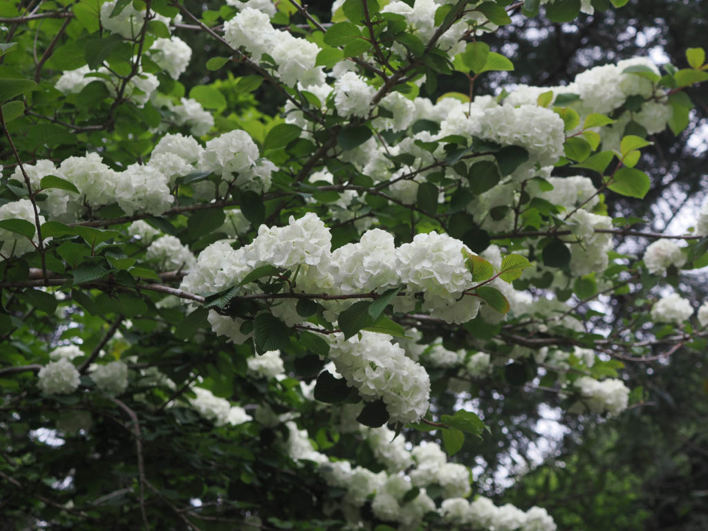 記事は書きませんでしたが、写真はできるだけ撮るようにしていました。写真の記録を見てみると、梨の花に続いて我が家の木々の花では、昨年の10月に紹介したオオデマリとコデマリの花が4月下旬に満開になりました。今年のコデマリは冬に剪定をしなかったためか、枝が長く垂れ下がり「垂れコデマリ」のようでした。隣家のオオデマリは今年も見事な花を咲かせました。このオオデマリはデュランタと共に、自分の庭か畑に植えようと昨年に挿し木にし、そのままあまり面倒を見なかったために、夏には葉を落として少ししか生き残らなかったものを小鉢に移したたことは以前に報告しました。