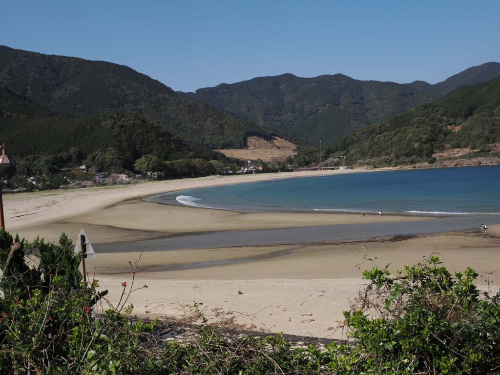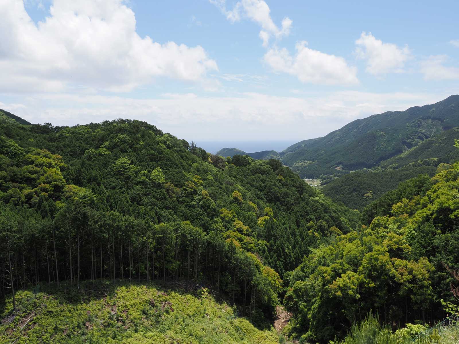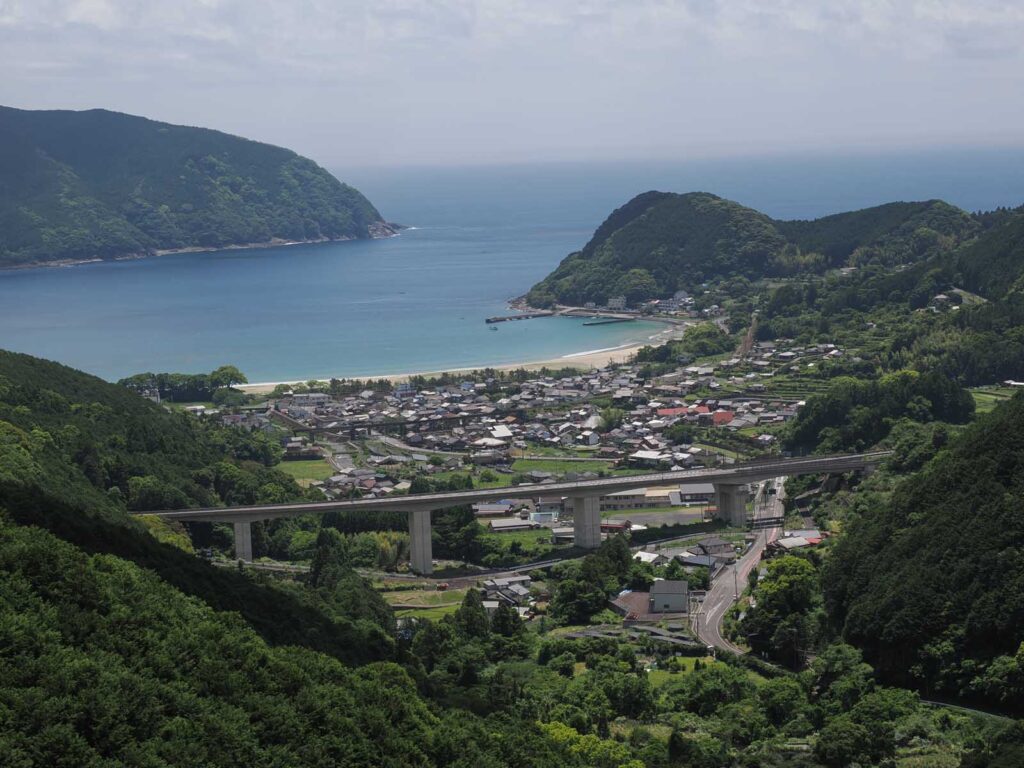 家から急な道を下り、川沿いの道路を数百メートルを歩いていくと綺麗な海岸に行き着きます。このあたりに町並みが有ります。山は海岸まで迫っていて急斜面に棚田の跡がたくさんありますが、現在耕作が行われている田圃はほとんどありません。私が住む谷の斜面とは違い、比較的広く美しい海岸に通じる谷筋の狭い県道を登っていくと峠にさしかかり、その先で内陸部を走る一級国道に通じています。県道の途中から見下ろす海の眺めは絶景です。また、付近の山の深さと植林された山肌はこの地の特徴的な眺めです。
